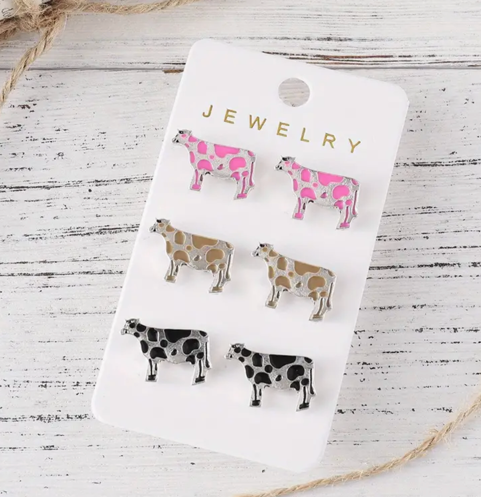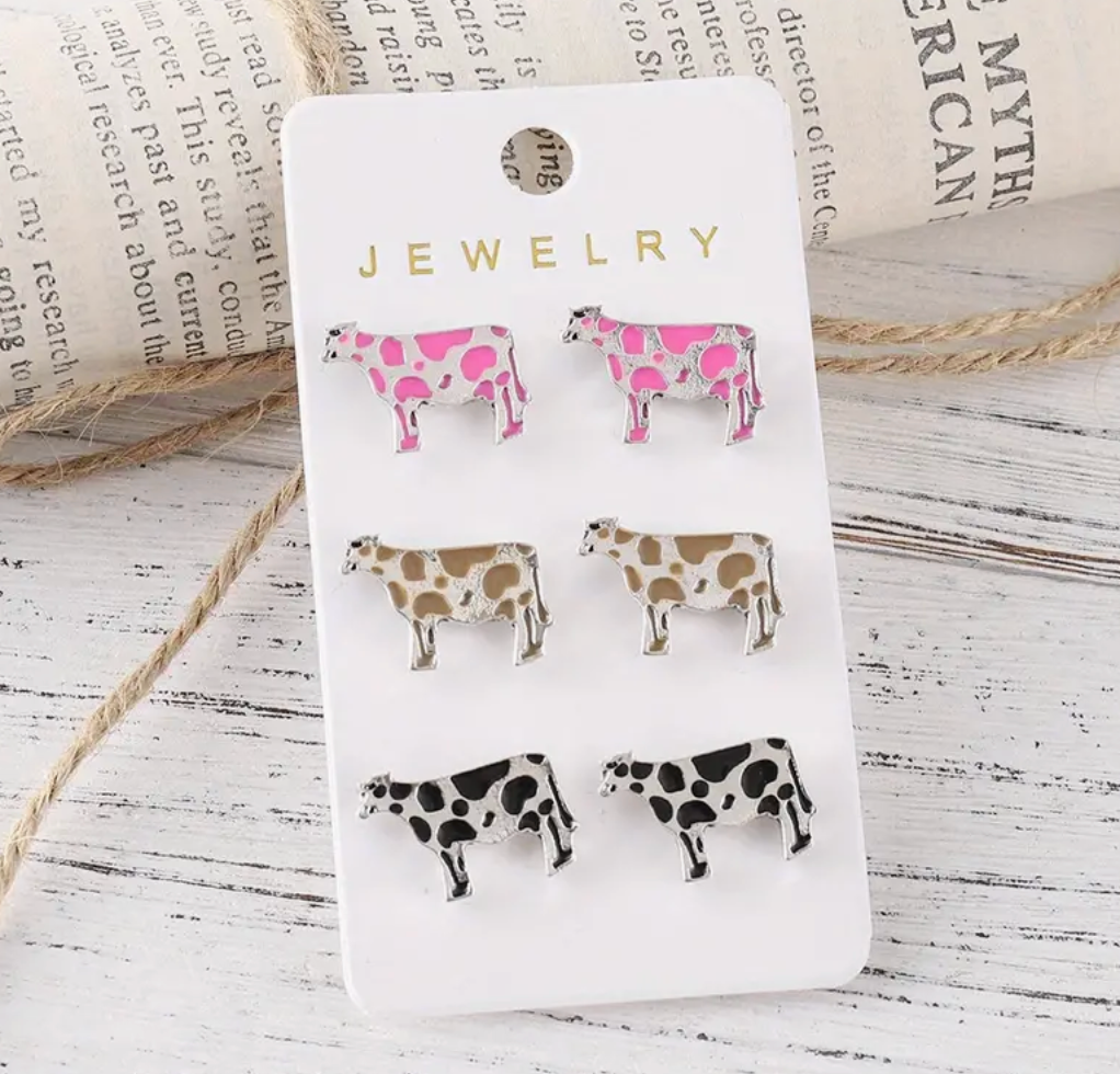 These 3 pk Cow Stud Earrings feature pink, black, and brown cow print designs. Made with quality materials, these earrings add a touch of whimsy to your outfit. Perfect for animal lovers or for adding a pop of fun to any look.