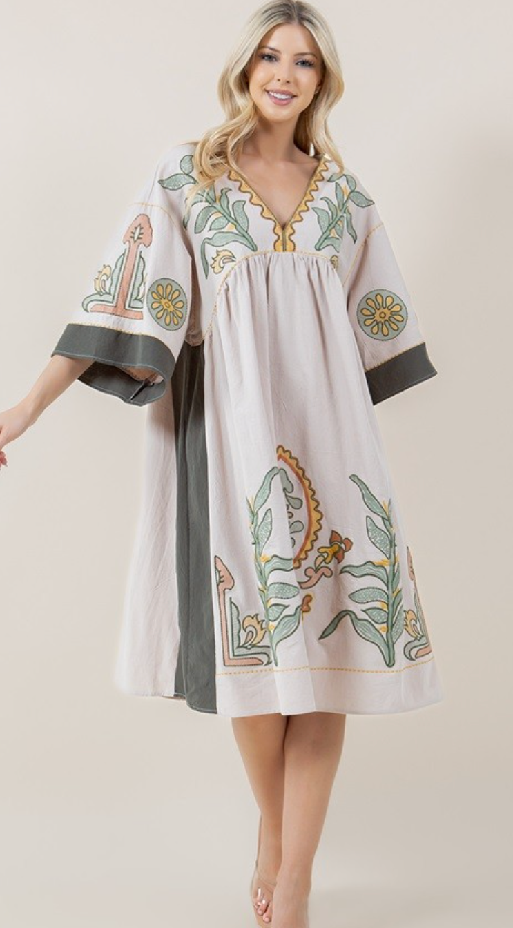 The boho embroidered babydoll dress features a charming design with a deep V-neck and 3/4 bell sleeves. The babydoll silhouette adds a touch of whimsy, creating a free-spirited and feminine look. The intricate embroidery enhances the bohemian aesthetic, adding texture and detail to the dress. The deep V-neckline and bell sleeves contribute to a relaxed yet stylish vibe, making it a perfect choice for casual outings or events with a boho-chic flair. This dress effortlessly combines comfort and fashion for a trendy and eye-catching ensemble.
