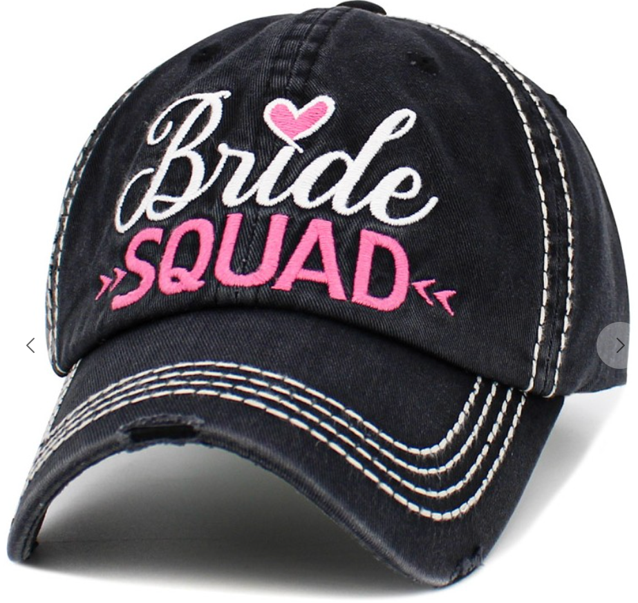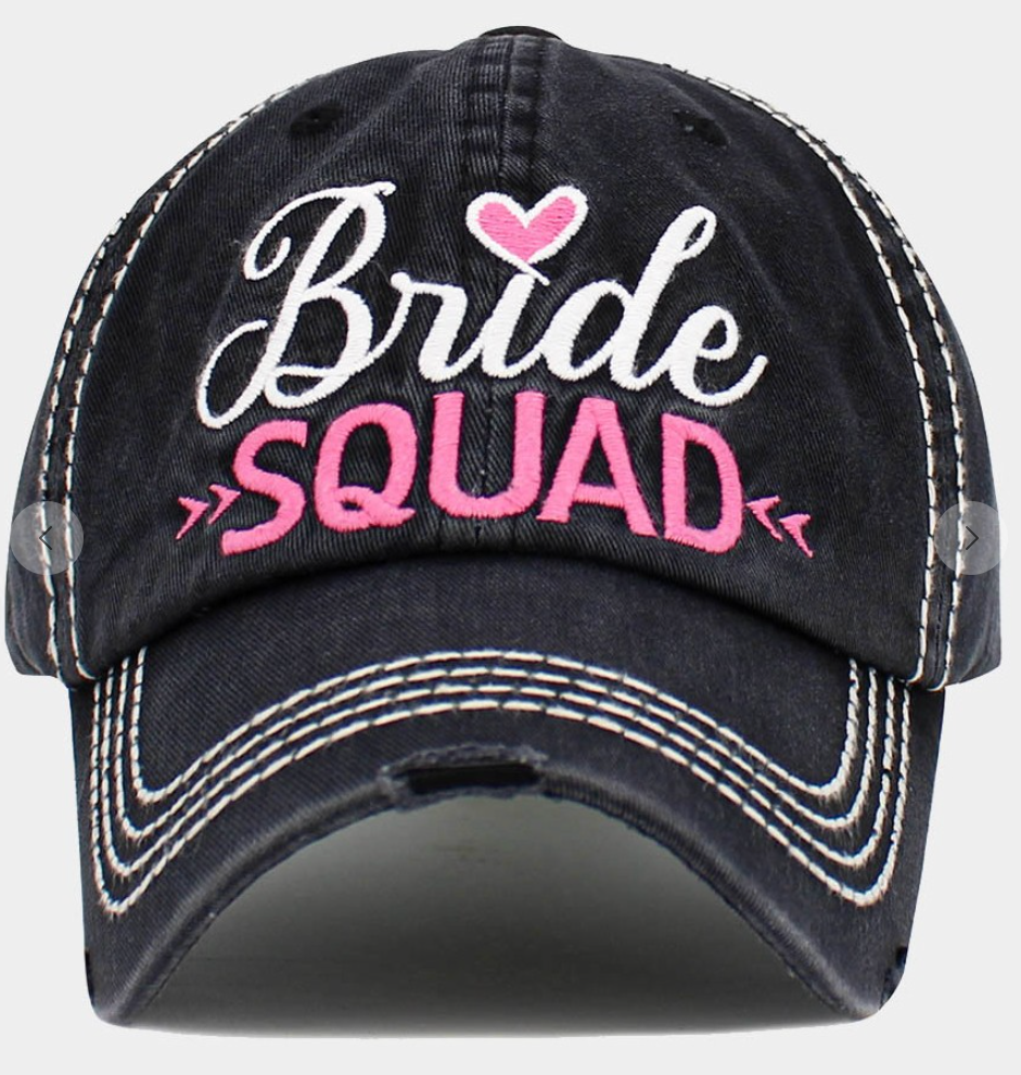This Bride Squad Cap is the essential accessory for any bachelorette party. With an adjustable crown circumference of 23 inches and a crown height of 4.25 inches, this vintage baseball cap is both stylish and comfortable. The brim height of 2.75 inches adds the perfect touch to showcase the "Bride Squad" message.
