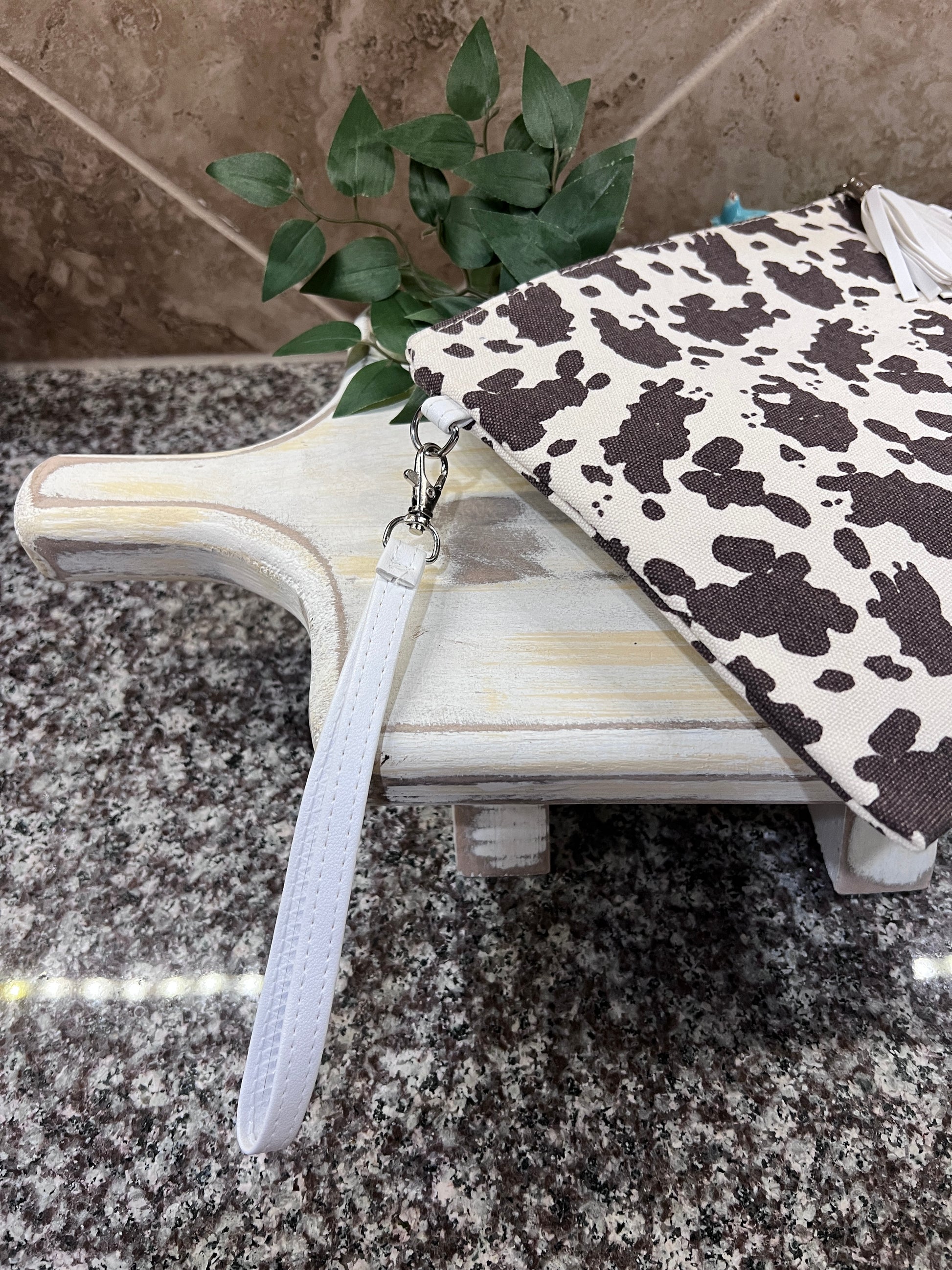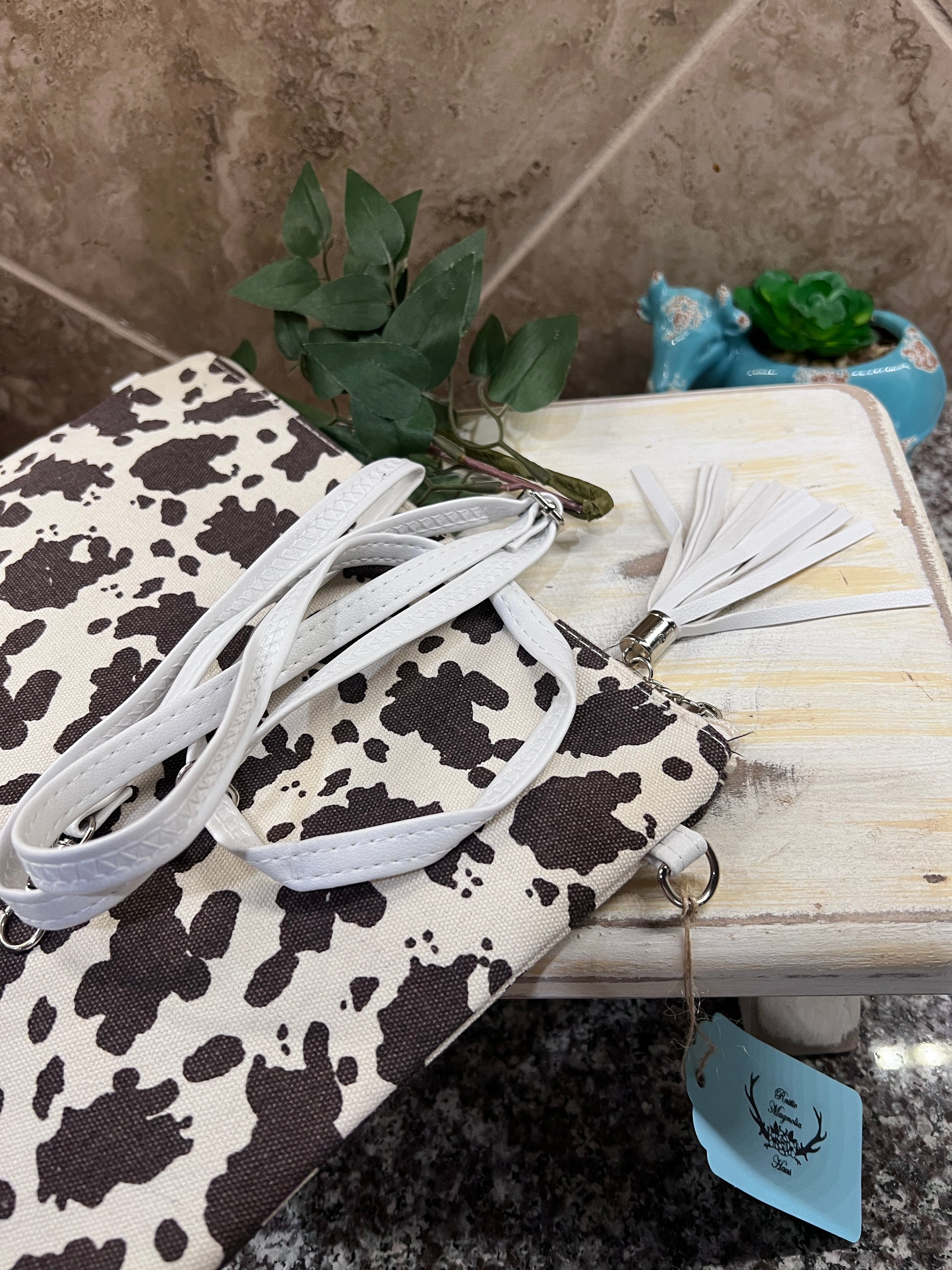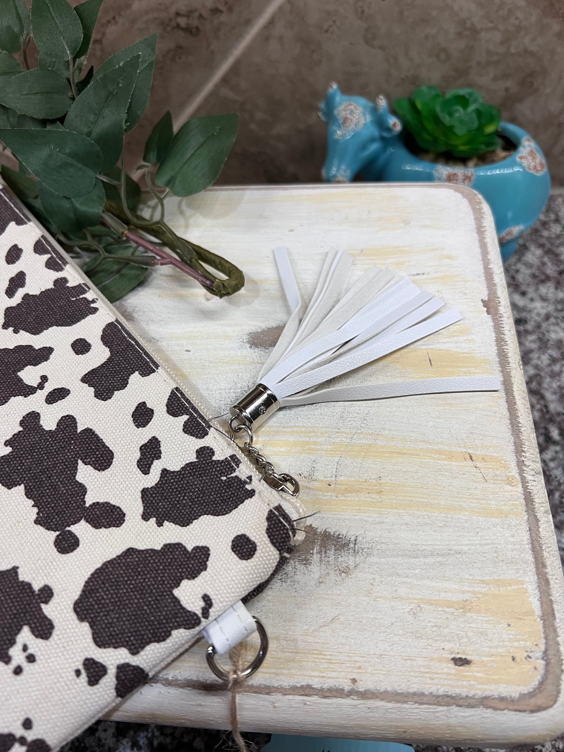 Whimsical fun brown and cream cow print crossbody with detachable cream wristlet, cream strap and tassel. Dark brown lining with inside pocket.