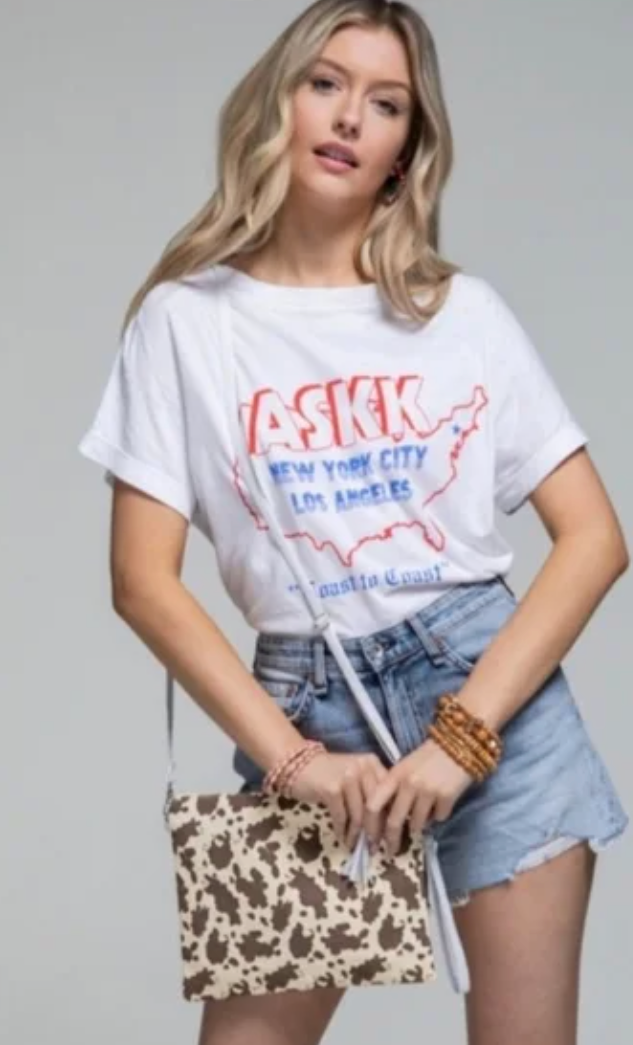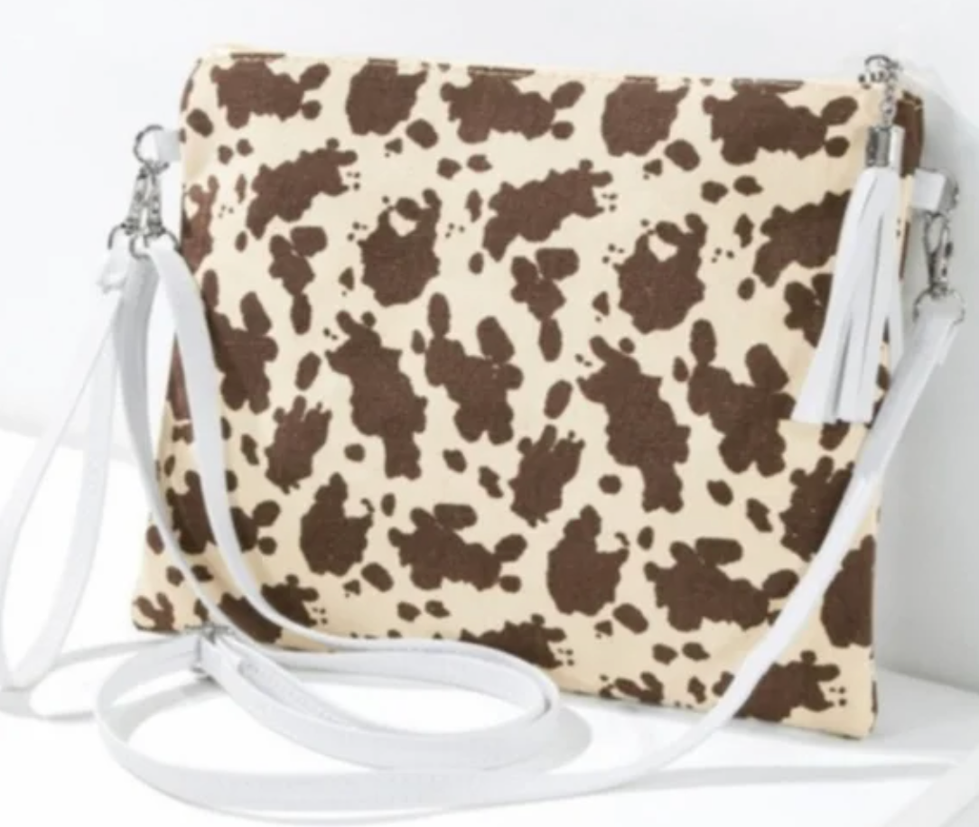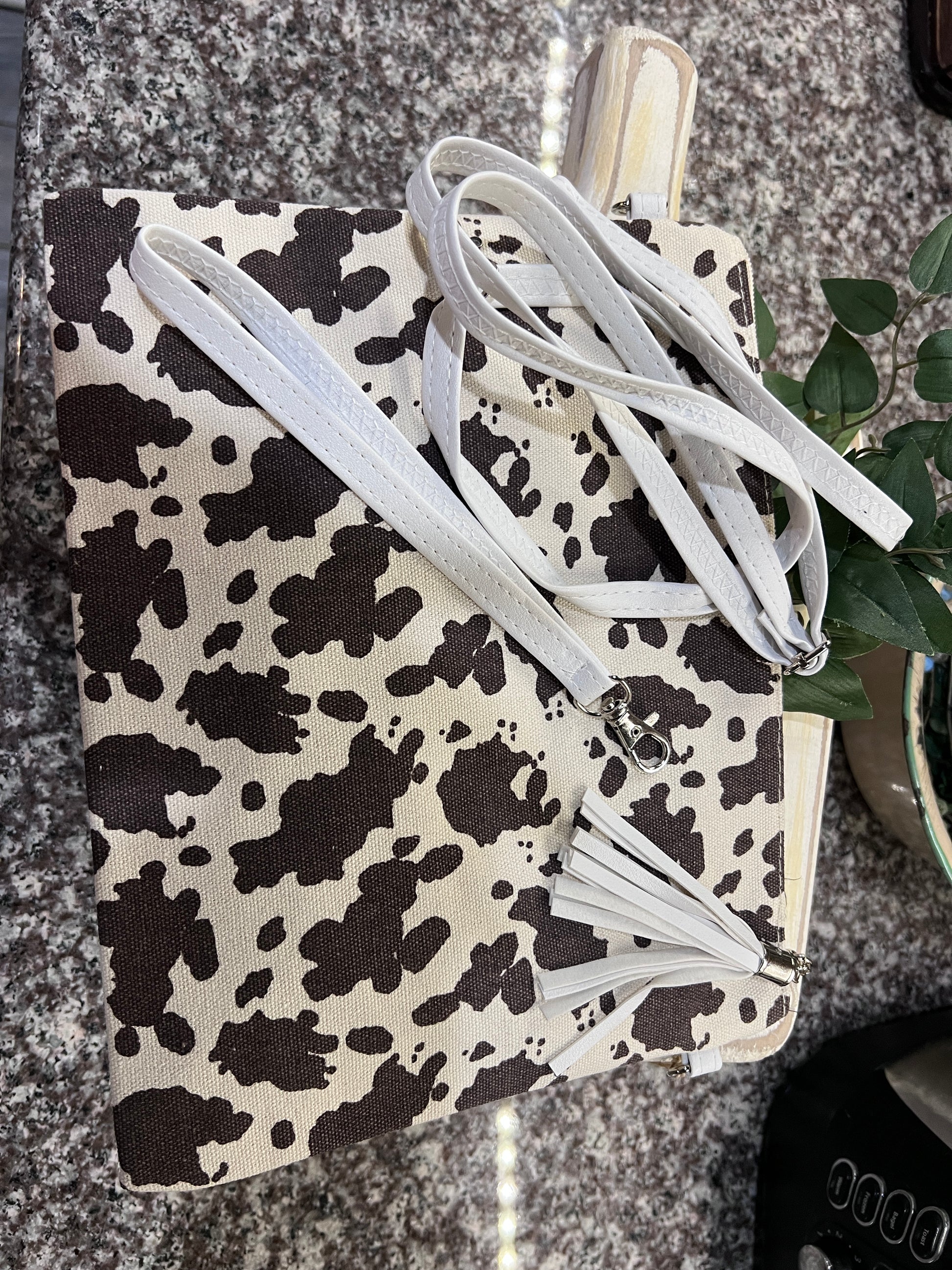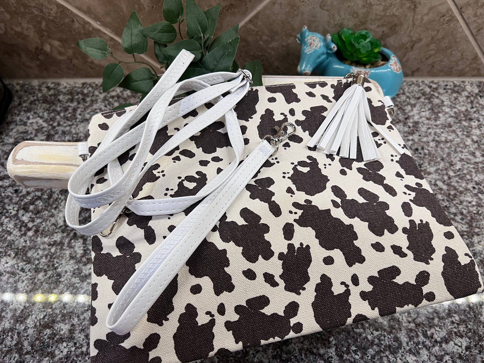 Whimsical fun brown and cream cow print crossbody with detachable cream wristlet, cream strap and tassel. Dark brown lining with inside pocket.