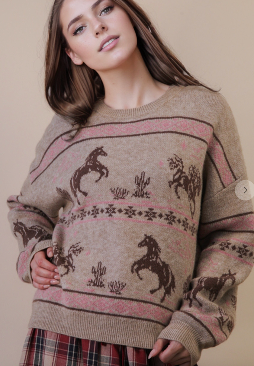 Embrace effortless Western style with this oversized knit sweater, designed for those who appreciate authentic ranch aesthetics. The relaxed silhouette features a classic round neckline and drop shoulders that create a contemporary, laid-back fit perfect for layering or wearing solo. Long sleeves and ribbed hem provide structure and comfort, while the graphic detailing adds character and conversation appeal. Ideal for casual wear, this piece transitions seamlessly from weekend adventures to everyday comfort.