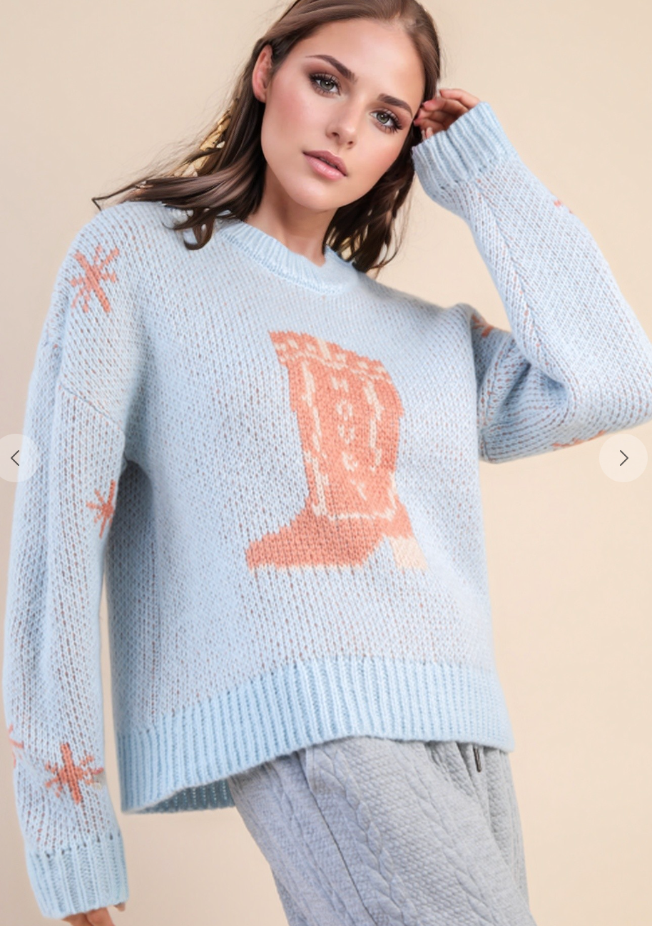 Embrace Western charm with this oversized knit sweater, featuring a striking cowboy boots graphic print that captures authentic ranch-style appeal. The relaxed silhouette showcases drop shoulders and a round neckline for effortless comfort, while long sleeves and ribbed hem provide a polished finish. Perfect for layering or wearing solo, this piece combines contemporary oversized styling with timeless Western aesthetics, making it an essential addition to any wardrobe seeking that coveted rustic-modern look.