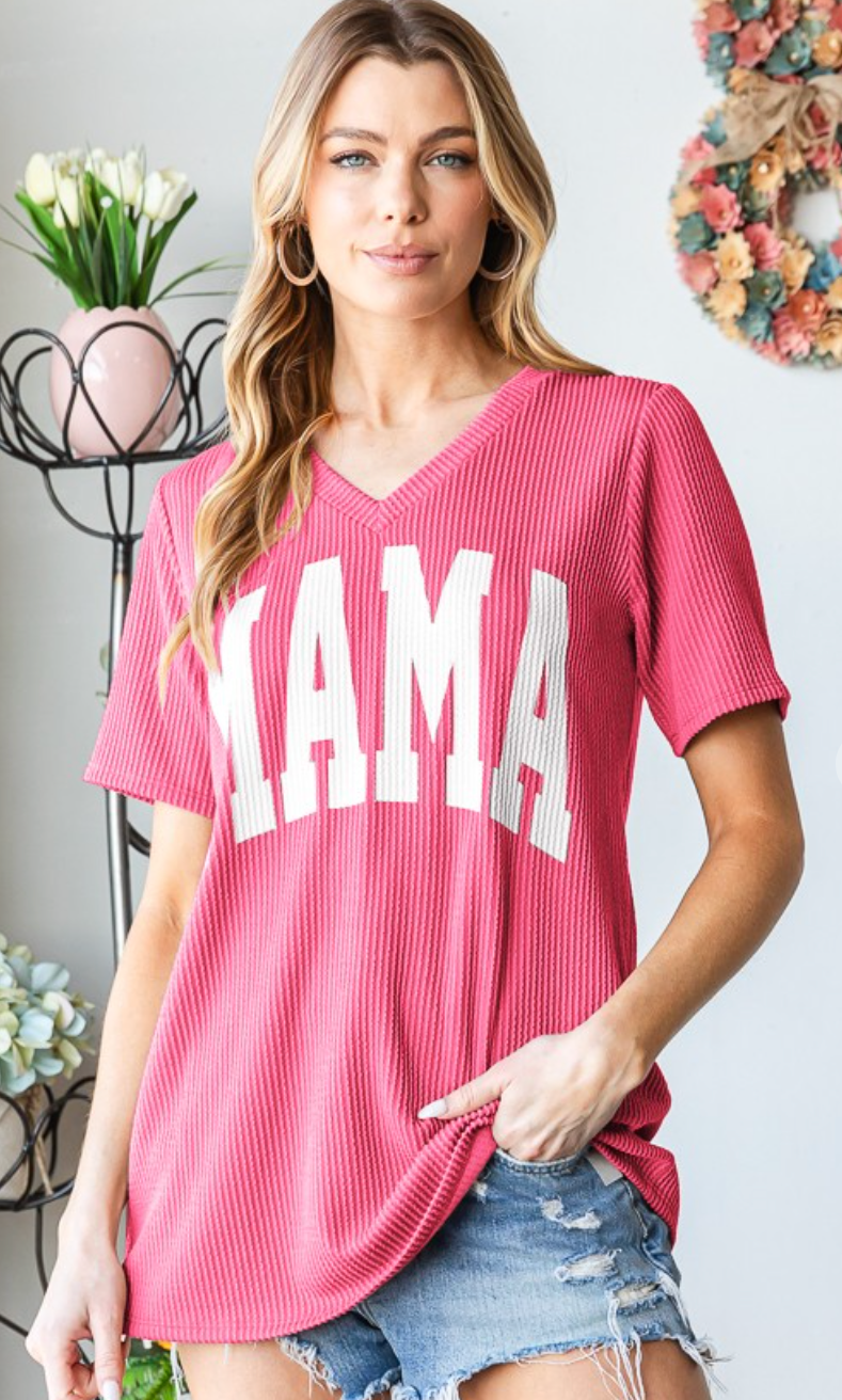 Stay comfortable and stylish in our Mama Ribbed Top. Made with a blend of 95% polyester and 5% spandex, this short sleeve V-neck top offers a perfect fit and feel. The solid urban ribbed design and lettering detail add a touch of urban sophistication. Plus, the variety of colors means there's one for every preference. Order now and experience ultimate comfort and style! Note: The garment color may vary slightly due to lighting and device differences.