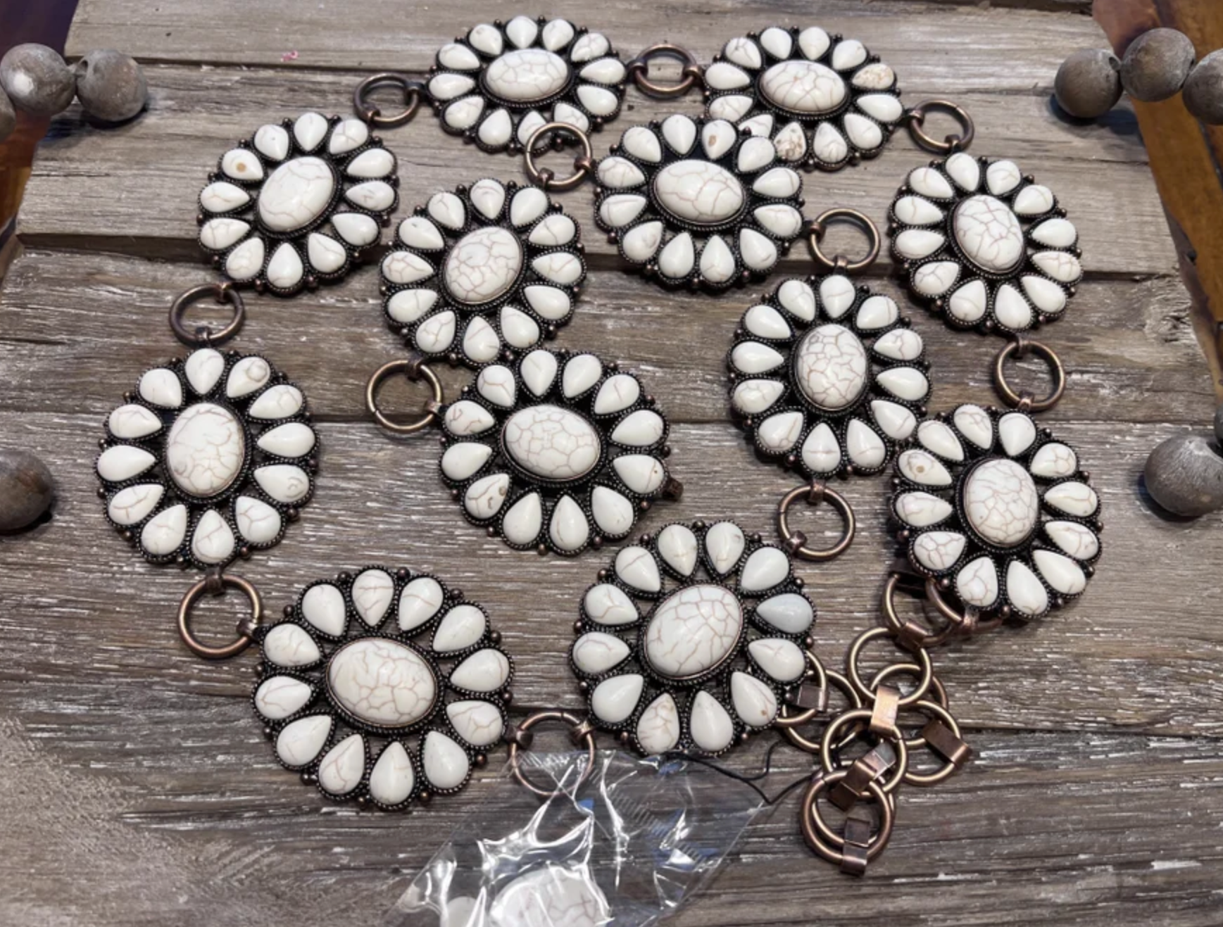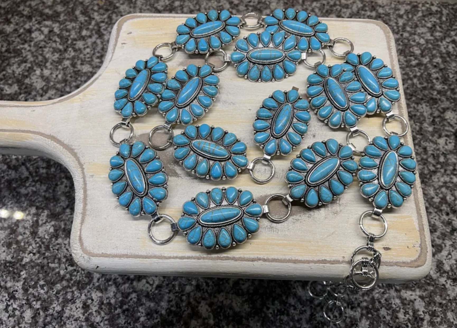 This gorgeous high quality oval stone concho belt will perfectly complete any outfit. Comes in Turquoise or White with Turquoise center stones.
