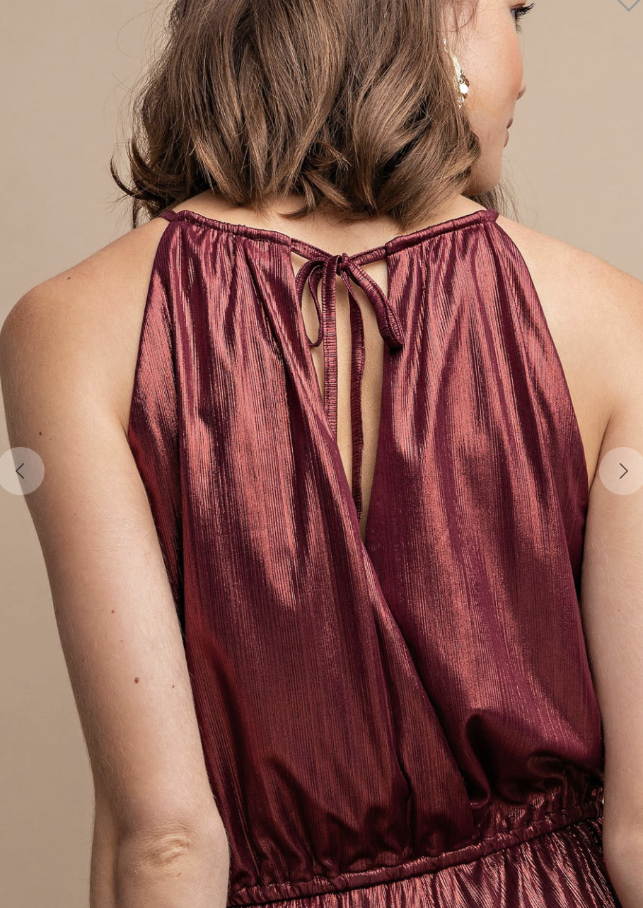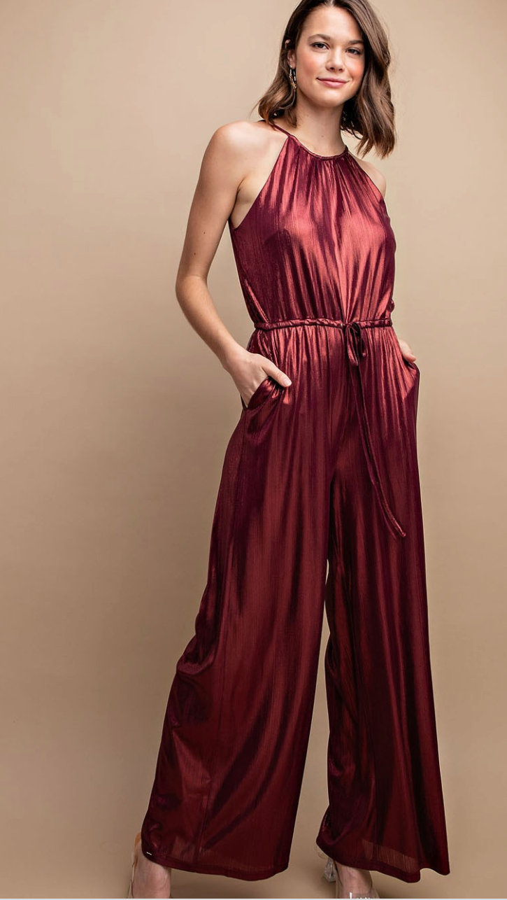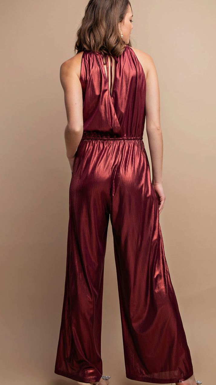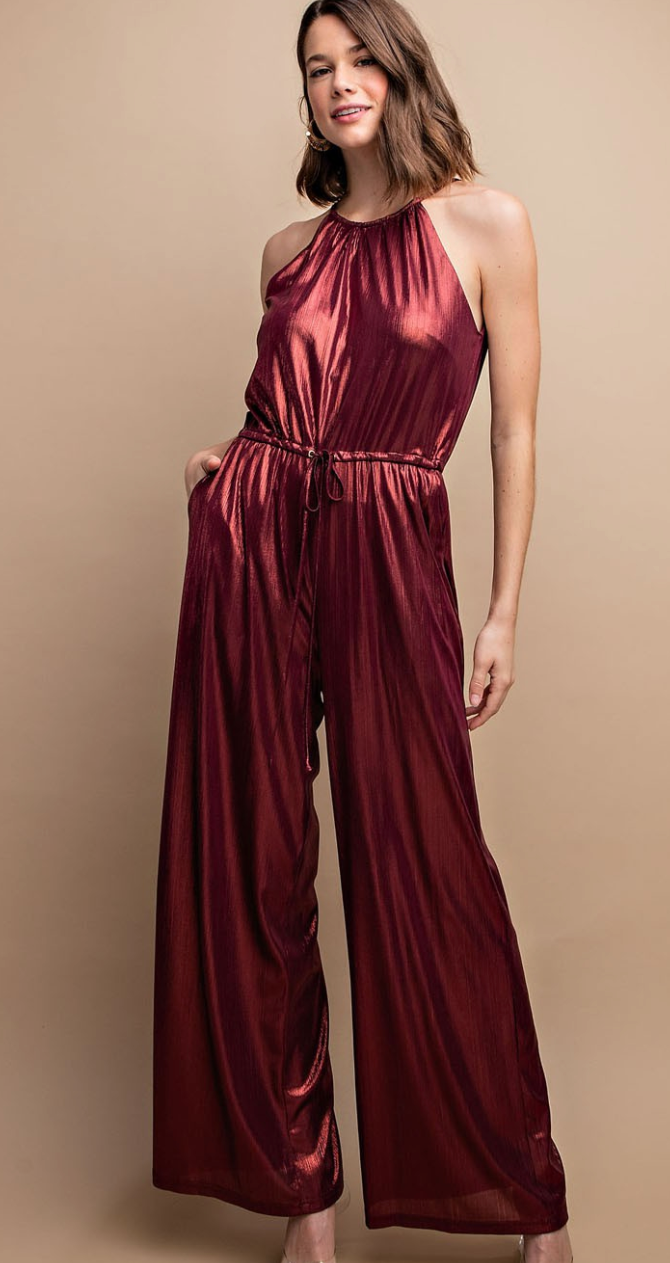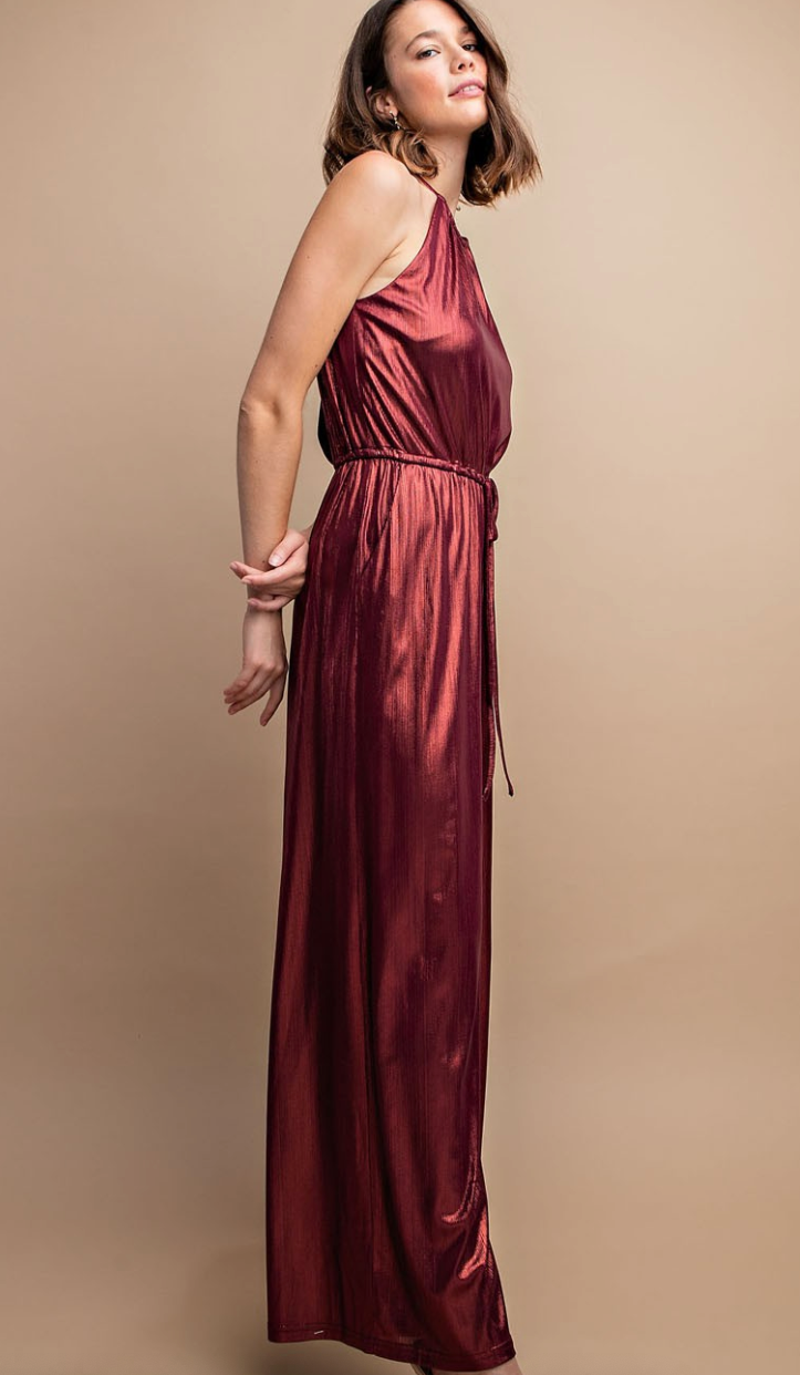This metallic jumpsuit features a drawstring waist with a back tie. Beautiful maroon/ burgundy color.