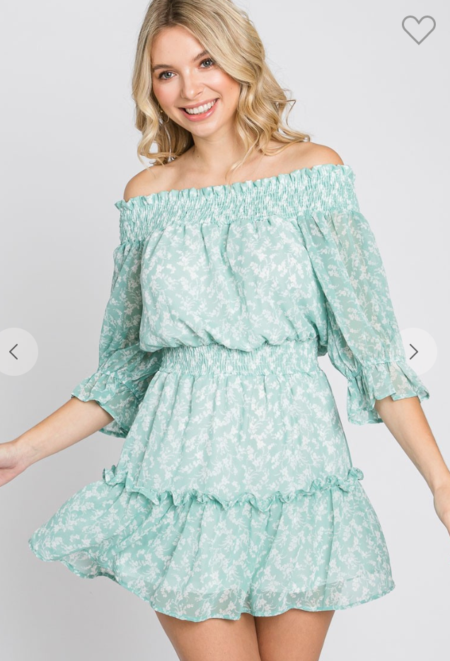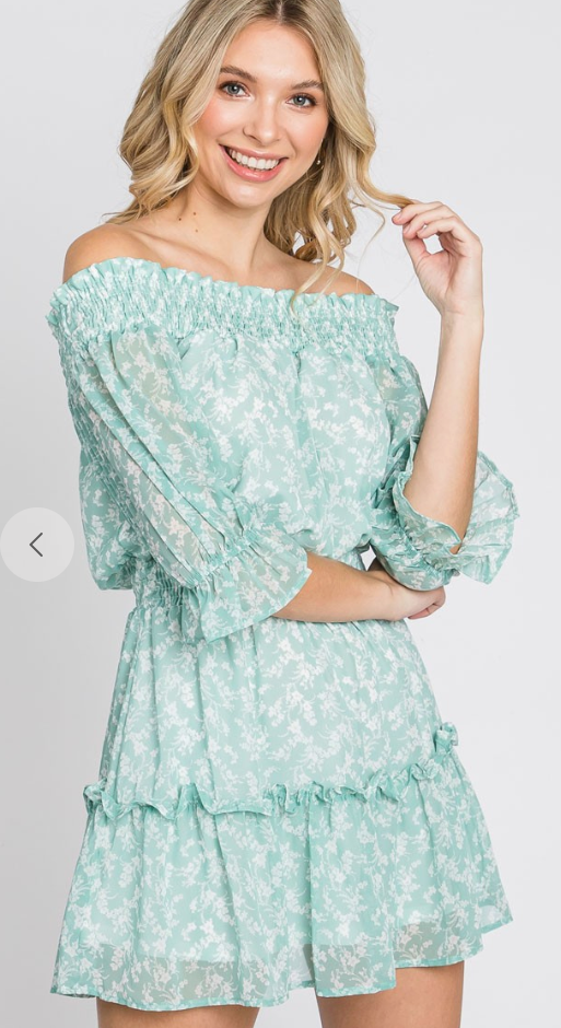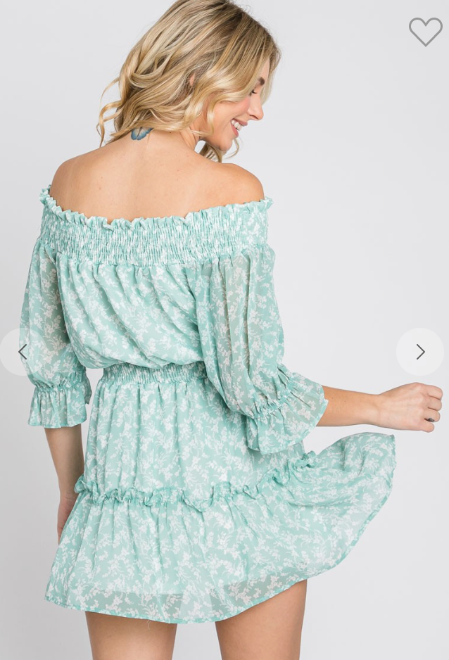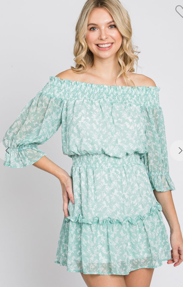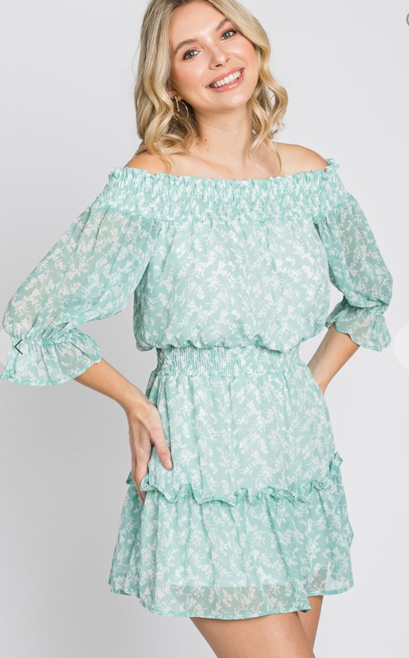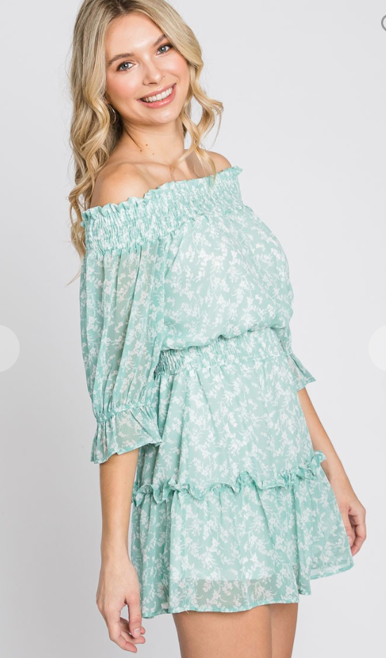 Look stylish and stay comfortable in this Mint Smocked Dress. Its smocked design allows for a perfect fit, and the off shoulder cut offers a fashionable touch. Crafted from premium fabric, this piece is sure to become a go-to in your wardrobe.