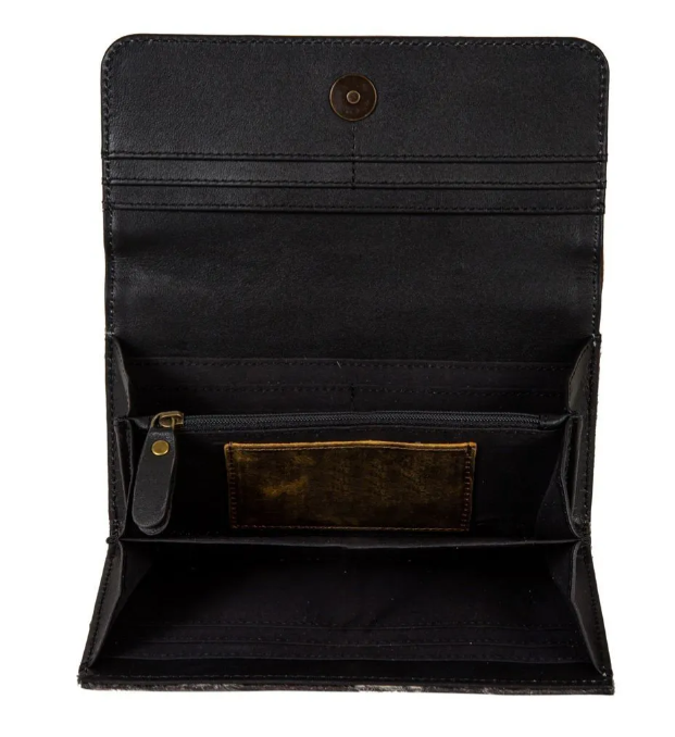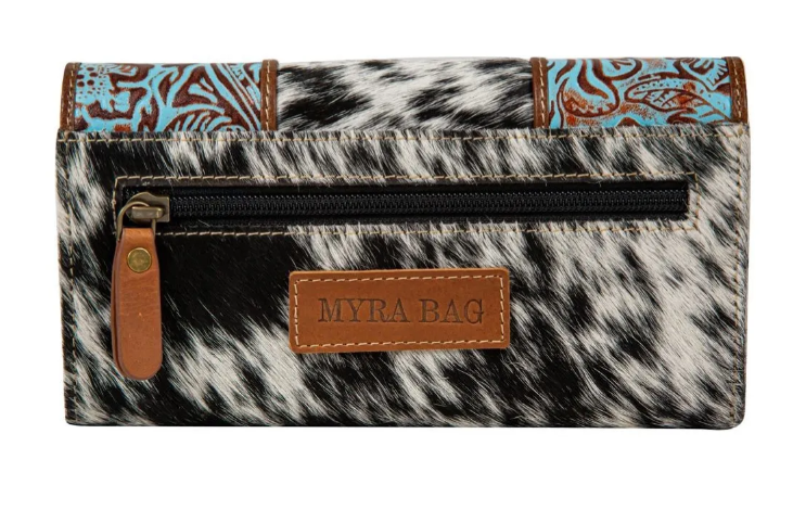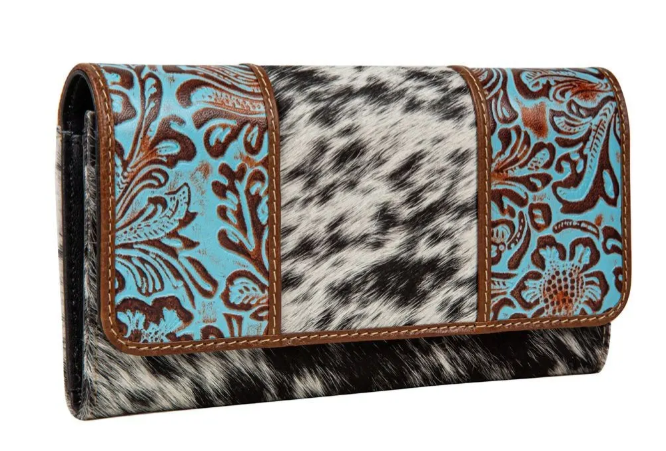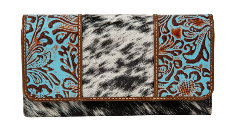 Beautiful cowhide wallet with brown and turquoise embossed leather accents! This wallet has a magnetic snap closure and the backside features a zipper pocket. Inside there are several card slots as well as a zipper pocket.