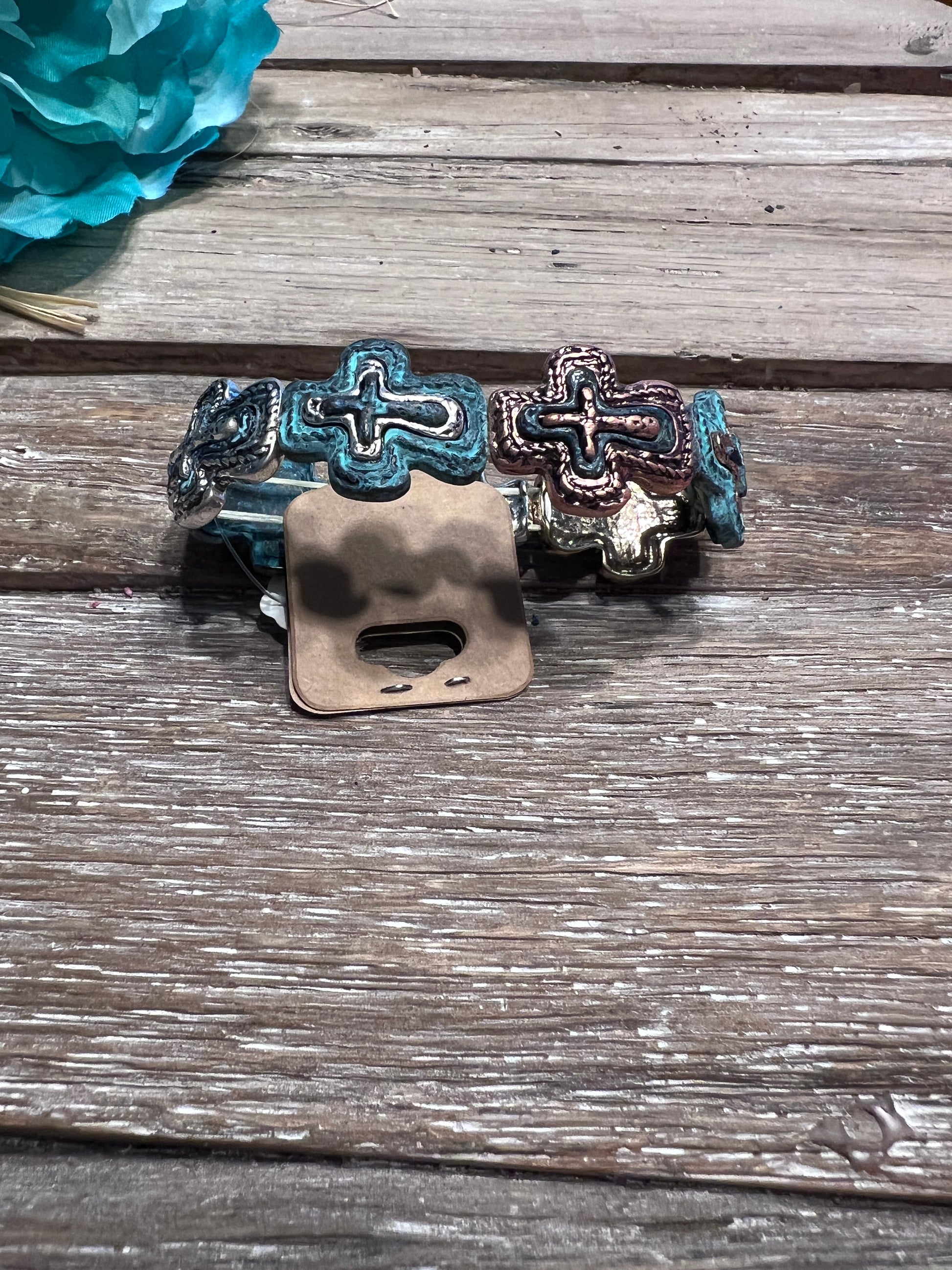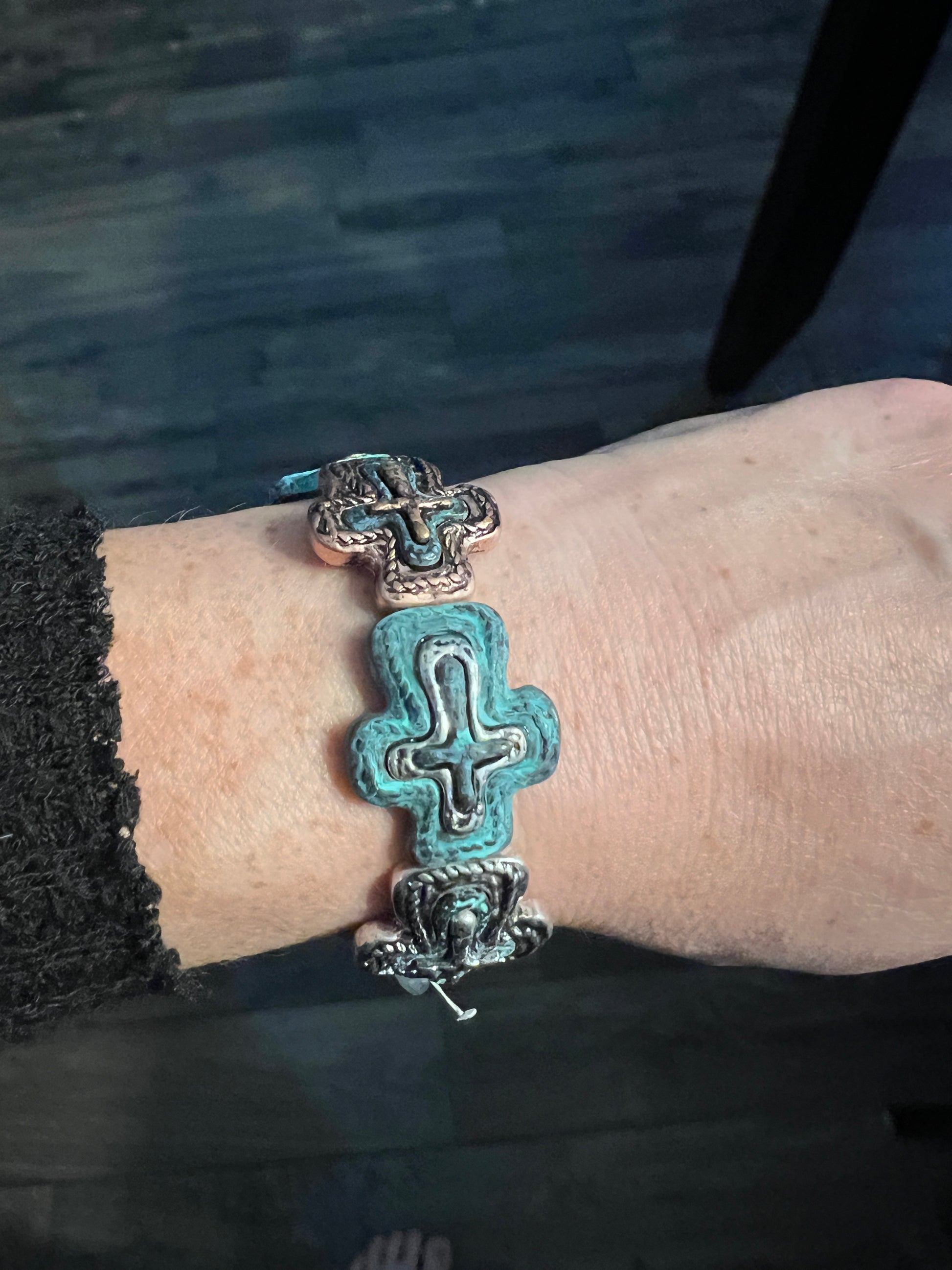 This multi-metal cross bracelet features a unique blend of copper, silver, and turquoise, creating a stunning and versatile piece of jewelry. The mixed metals add a modern touch to the traditional cross design, making it a must-have accessory for any outfit. Crafted with high-quality materials, this bracelet is both durable and stylish.
