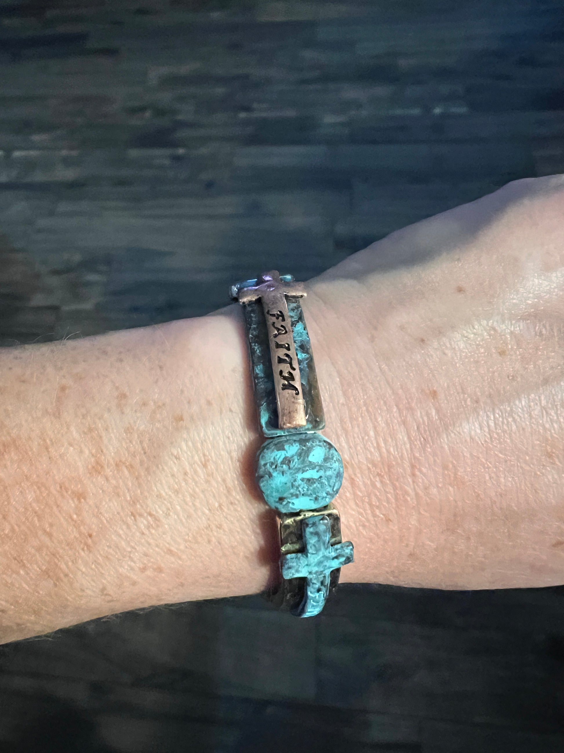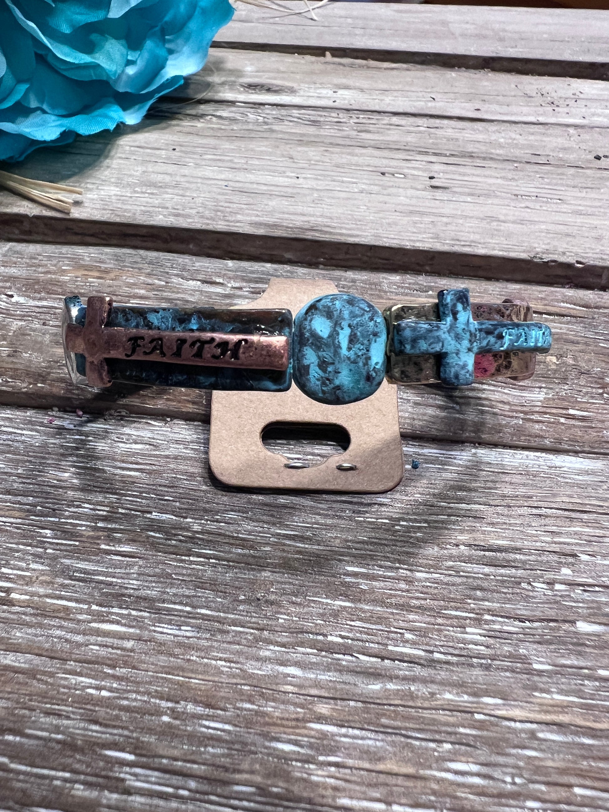 Experience the uplifting power of faith with our Multi Metal Inspirational Bracelet. Made with a mix of metals and adorned with turquoise stones, this stretch bracelet adds a touch of inspiration to any outfit. Wear it as a reminder to stay true to your beliefs and radiate positive energy.