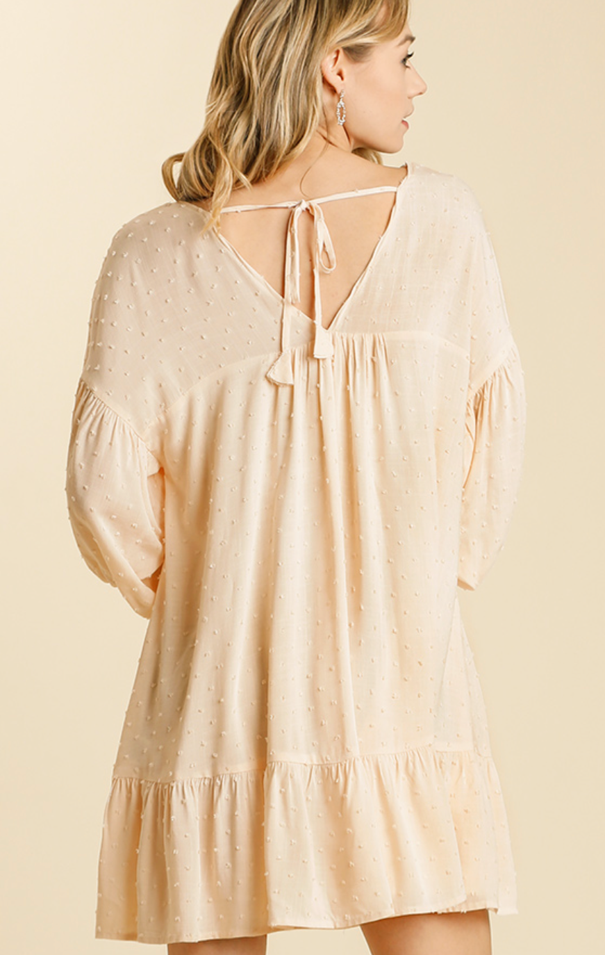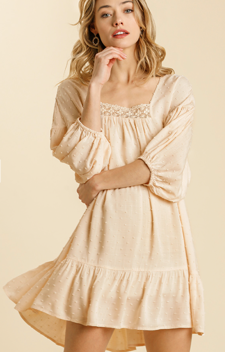 Gorgeous Swiss Dot Lace Detail 3/4 Sleeve Ivory dress, features string-tie back, has a ruffle hem and has no lining.