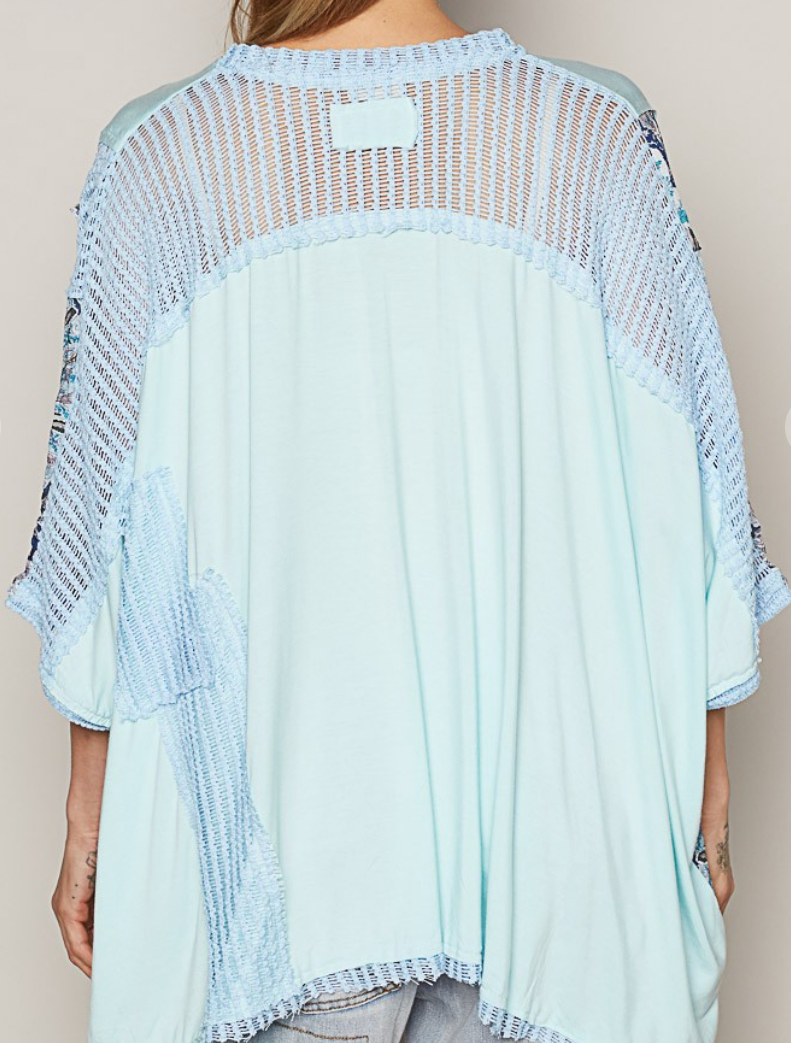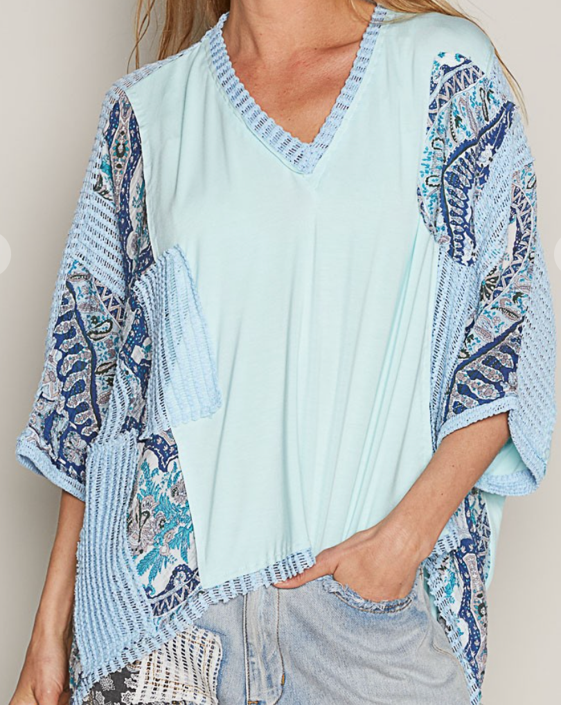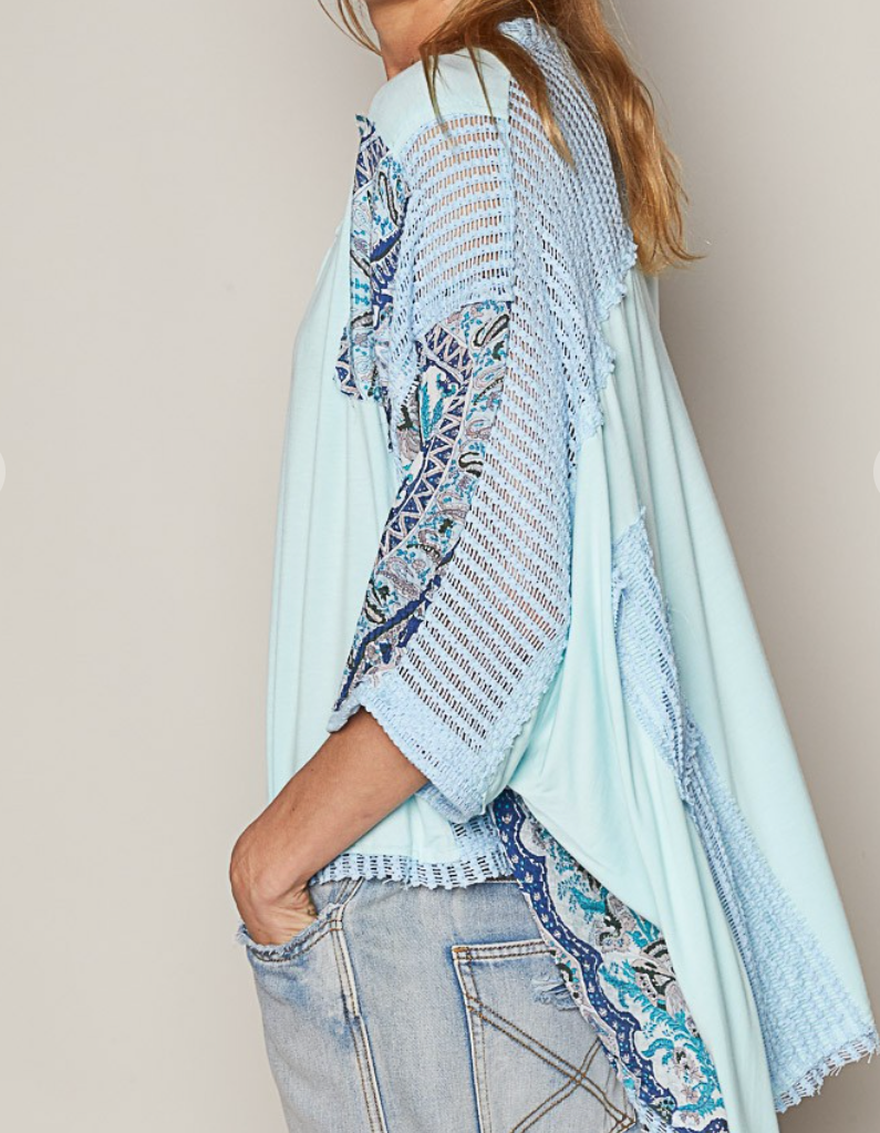 Expertly designed for comfort and style, the No More Blues Top features a V-neckline, oversized fit, and drop shoulder for a modern look. The mixed print and see-through knit add a touch of sophistication, while the frayed edge detailing gives a unique edge. Made with Pol's jersey for ultimate comfort.