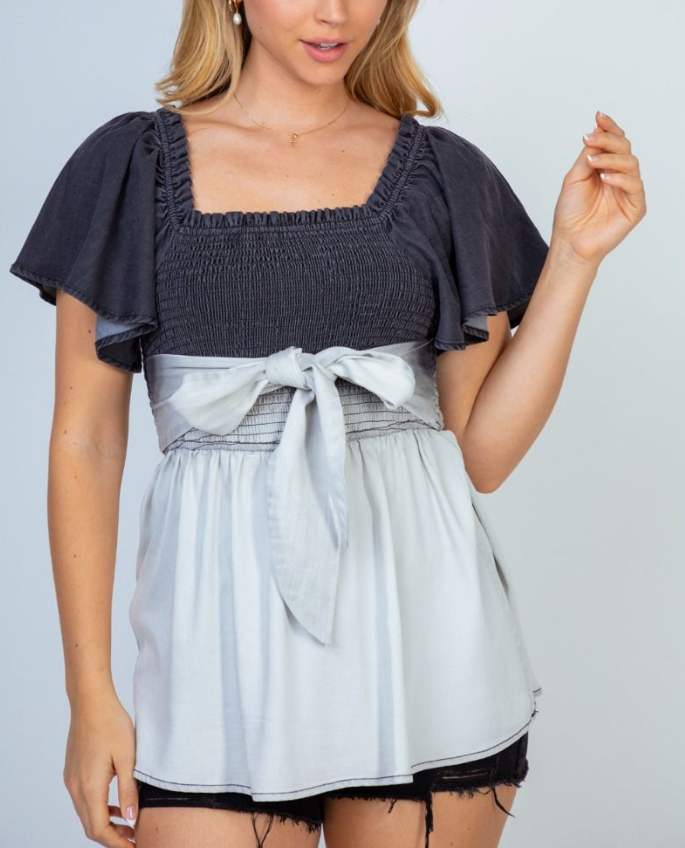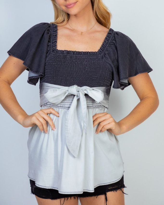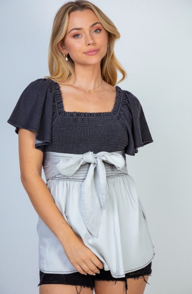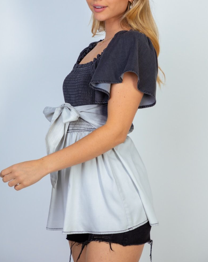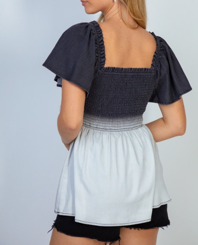 A short sleeve ombre denim top with a square neck featuring a smocked bodice and a peplum skirt. Fabric is a lightweight washed denim.