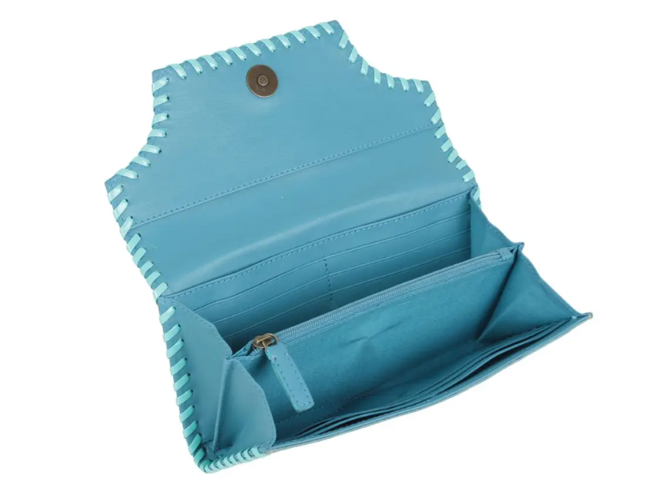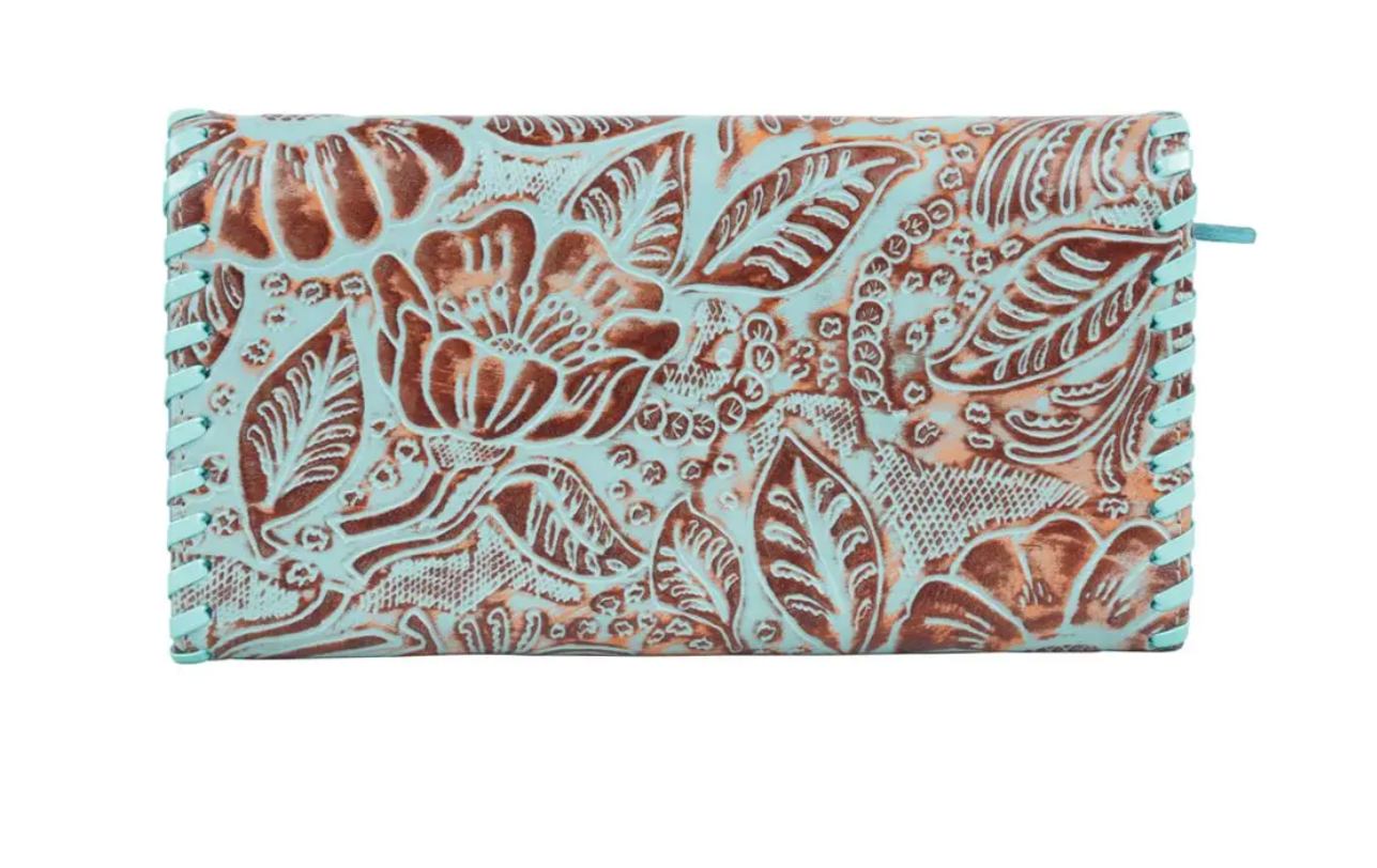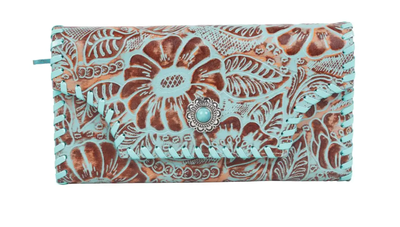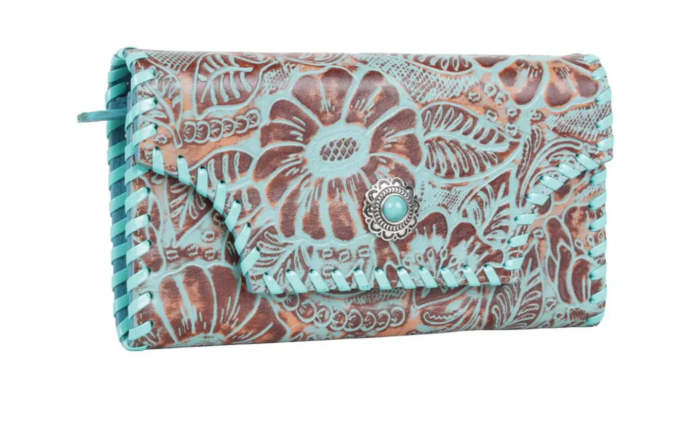 Gorgeous embossed turquoise and brown leather with turquoise buck-stitch trim and a faux silver Concho with a turquoise accent. Made by Myra Bags.