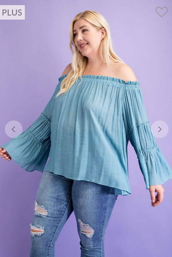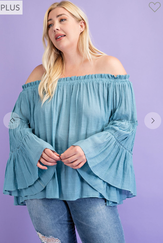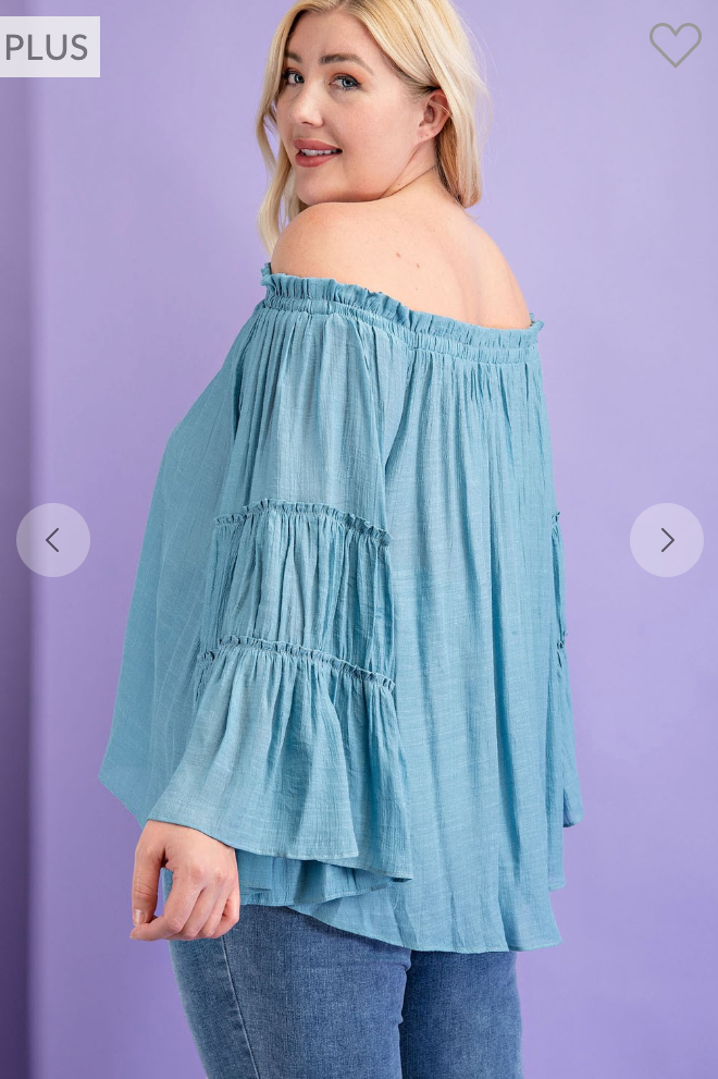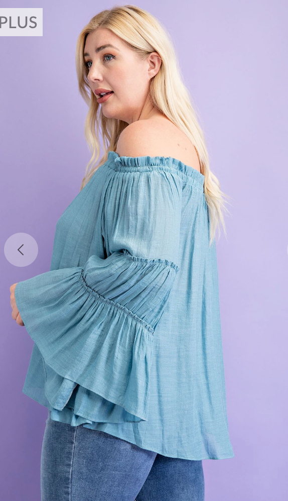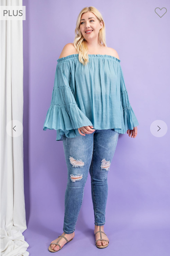 This plus denim colored off shoulder top is perfect for special occasions or everyday wear. Featuring long dramatic ruffle flare sleeves, this flattering top will make an unforgettable statement.