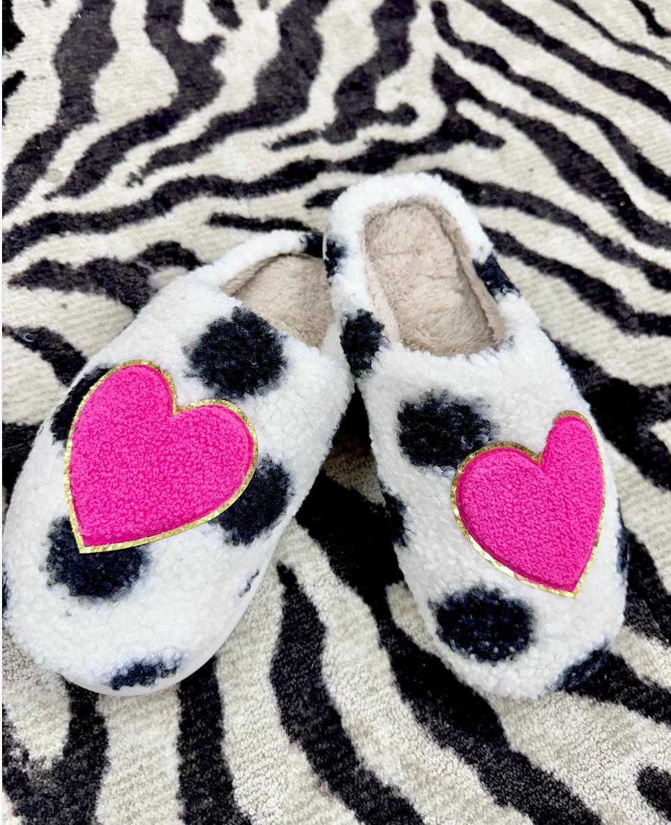 Elevate your loungewear with our Polka Dot Heart Slippers! These black and white sherpa slippers feature cute hot pink hearts and a touch of gold, perfect for adding a playful touch to any outfit. Available in women's sizes, they are cozy, stylish, and perfect for a cozy day at home or as a statement piece.