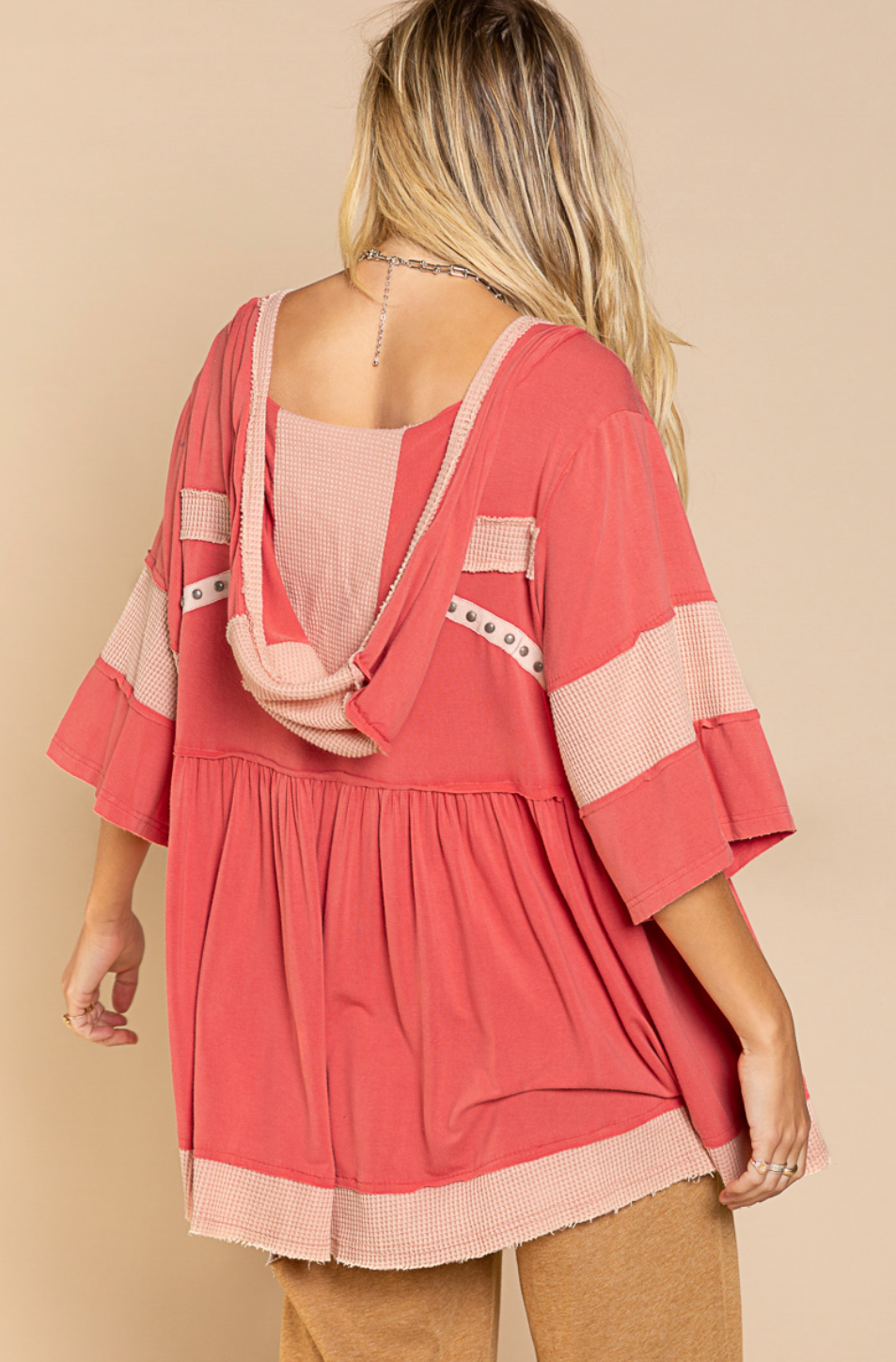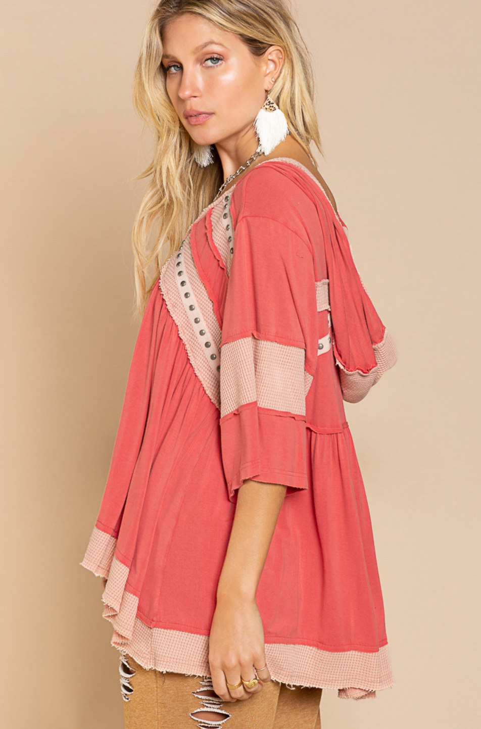 The Pretty in Pink Top combines style and comfort with a V neckline and hoody design, 1/2 sleeve length, and mix of thermal fabric. The stud trim and raw edge hemline add a unique touch, all in Pol's special knit and thermal material blend. This versatile top is made with 94% rayon and 6% spandex for a perfect fit.