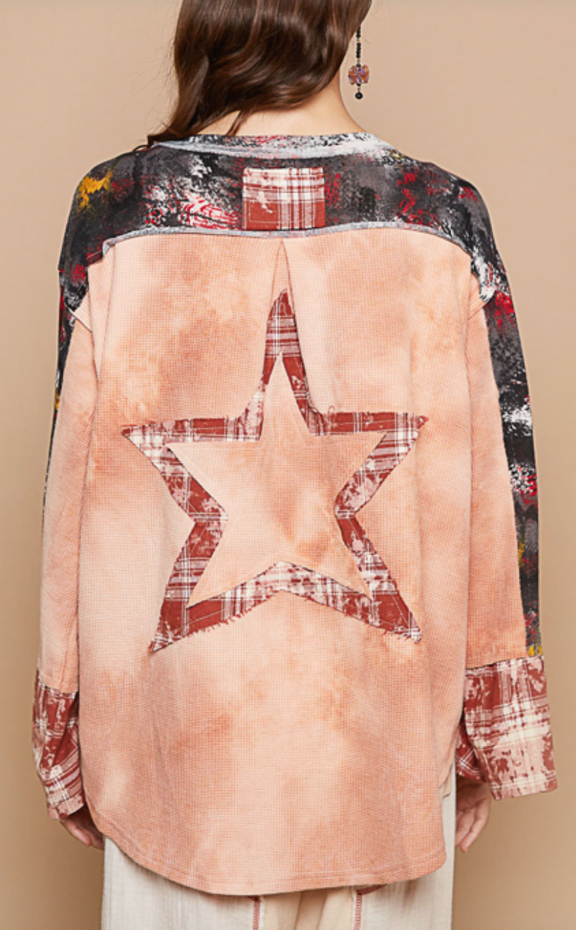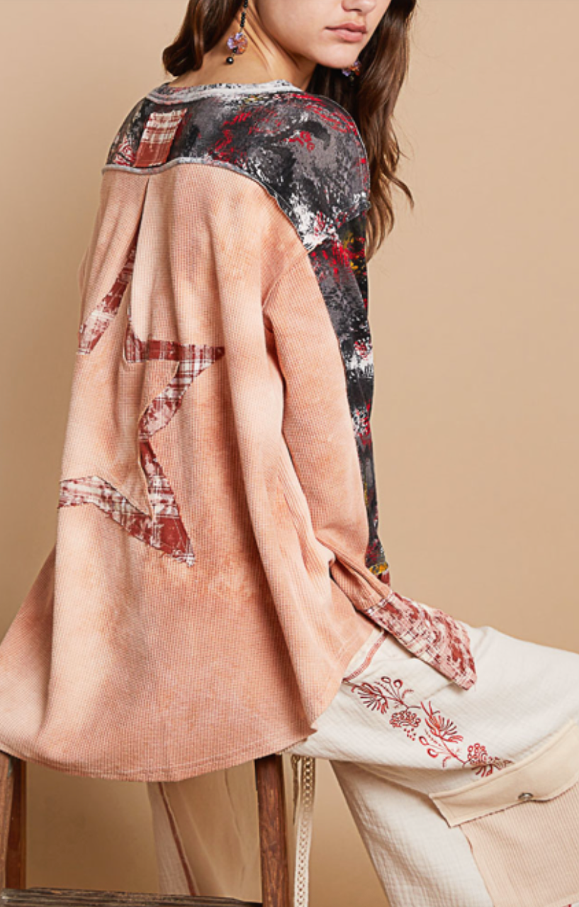 The Pumpkin Patch Top features a round neck and ruffle sleeves, crafted for a roomy, comfortable fit. Made from a soft thermal blend of 65% polyester and 35% rayon, it offers warmth and breathability. The plaid contrast detail adds a stylish touch, making it a versatile piece for layering in cooler weather.