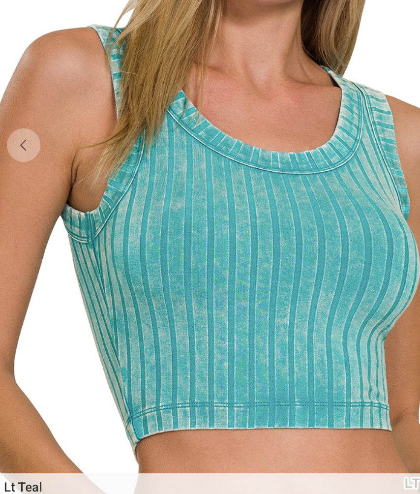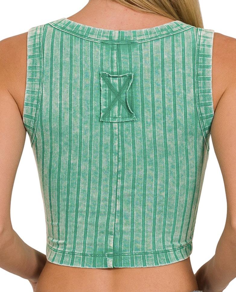 This ribbed sleeveless crop tank features a flattering scoop neckline and a comfortable, form-fitting design. Crafted with a textured ribbed fabric, it offers both style and breathability. The back patch detail adds a subtle touch of distinction, making it a versatile piece for layering or wearing alone in warmer weather. Ideal for pairing with high-waisted bottoms, this tank combines modern aesthetics with everyday comfort.