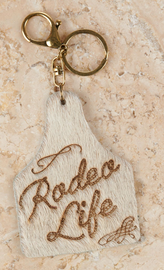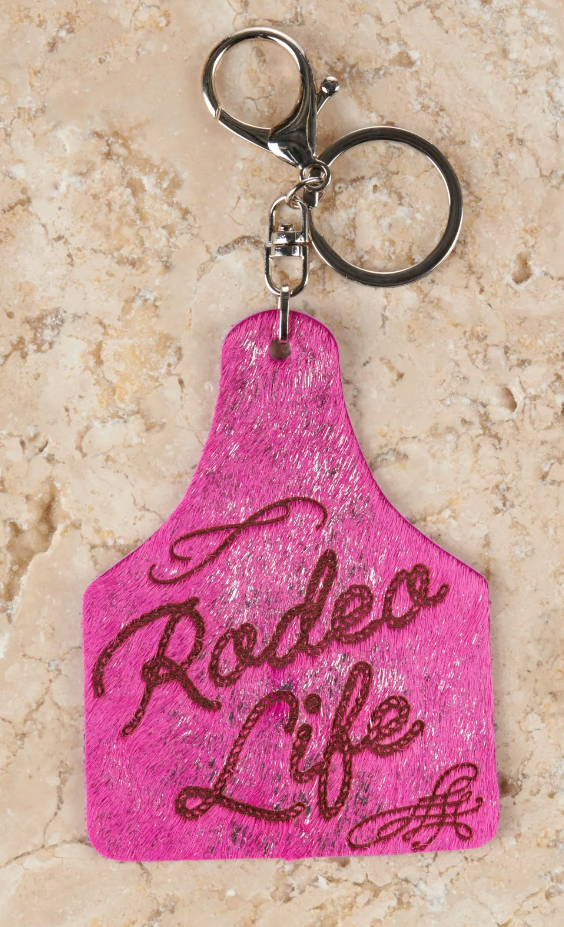 Calling all rodeo fans, this keychain is for you! Cowhide Leather cow ear tag keychain with silver(Hot Pink) and gold (White) key ring and clasp. Available in White or Hot Pink.