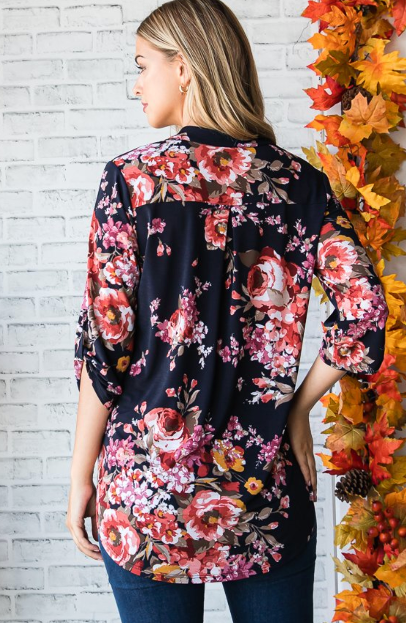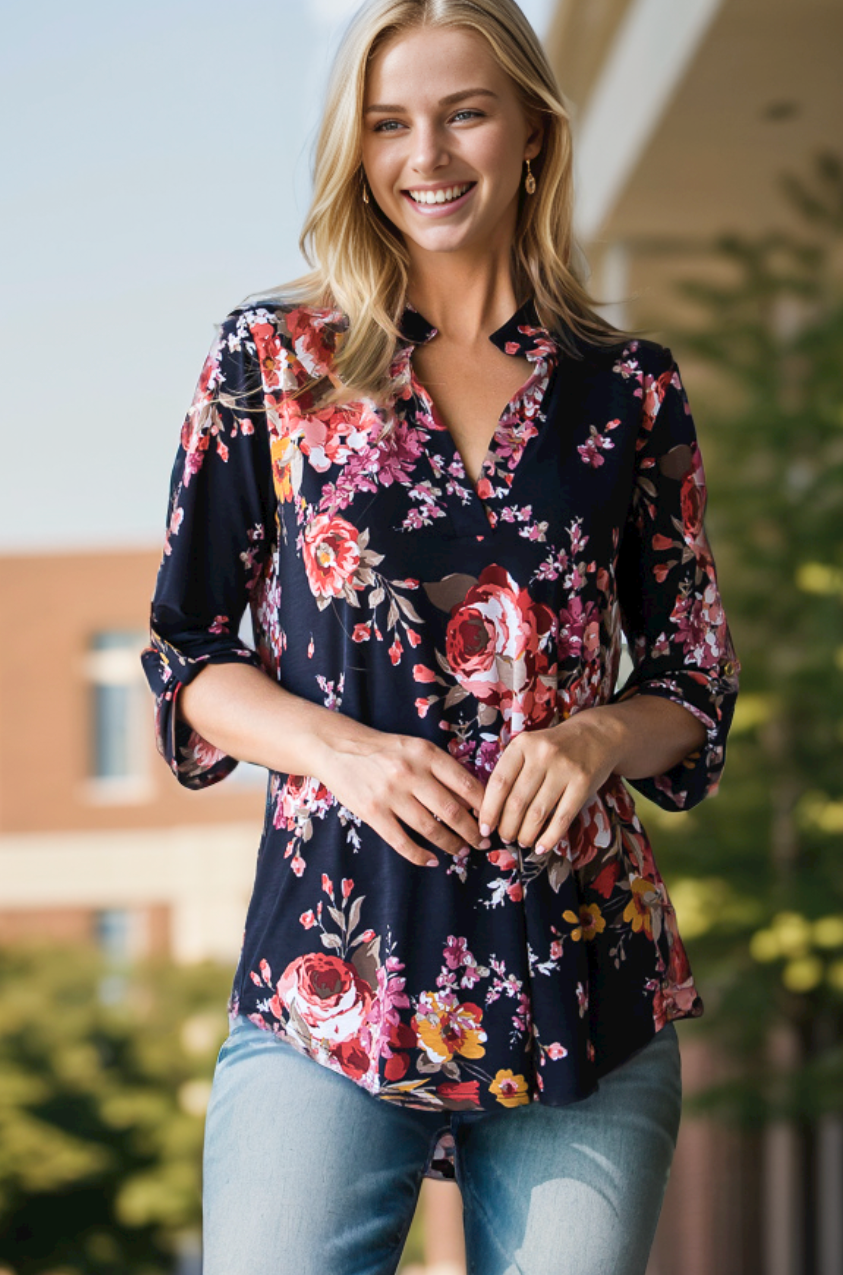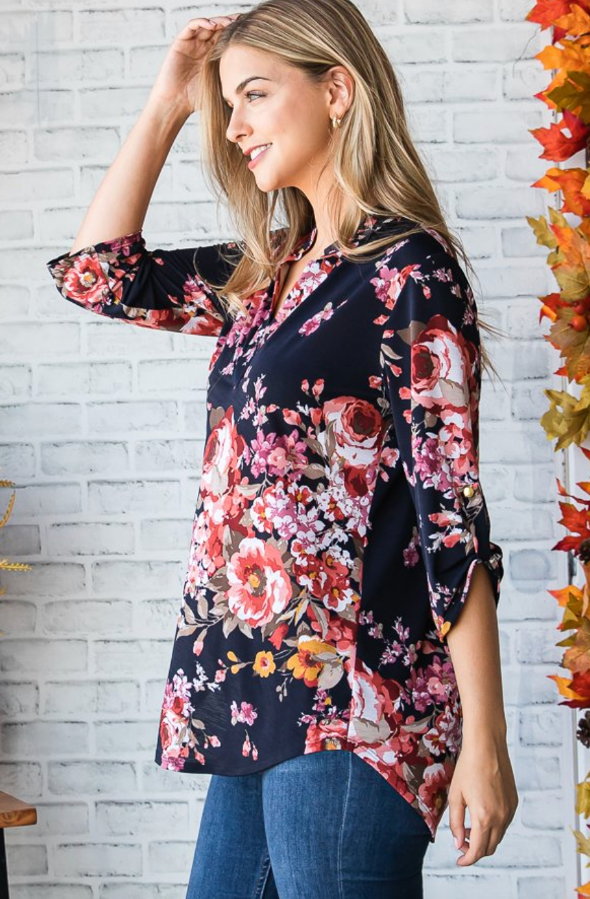 Expertly crafted from a blend of 95% polyester and 5% spandex, the Romantic Floral Top features a stylish three-quarter button sleeve, mandarin collar, and a vibrant multi-color floral print. The dolphin hem detail adds a touch of elegance to this must-have piece. Perfect for a romantic outing or a day at the office.