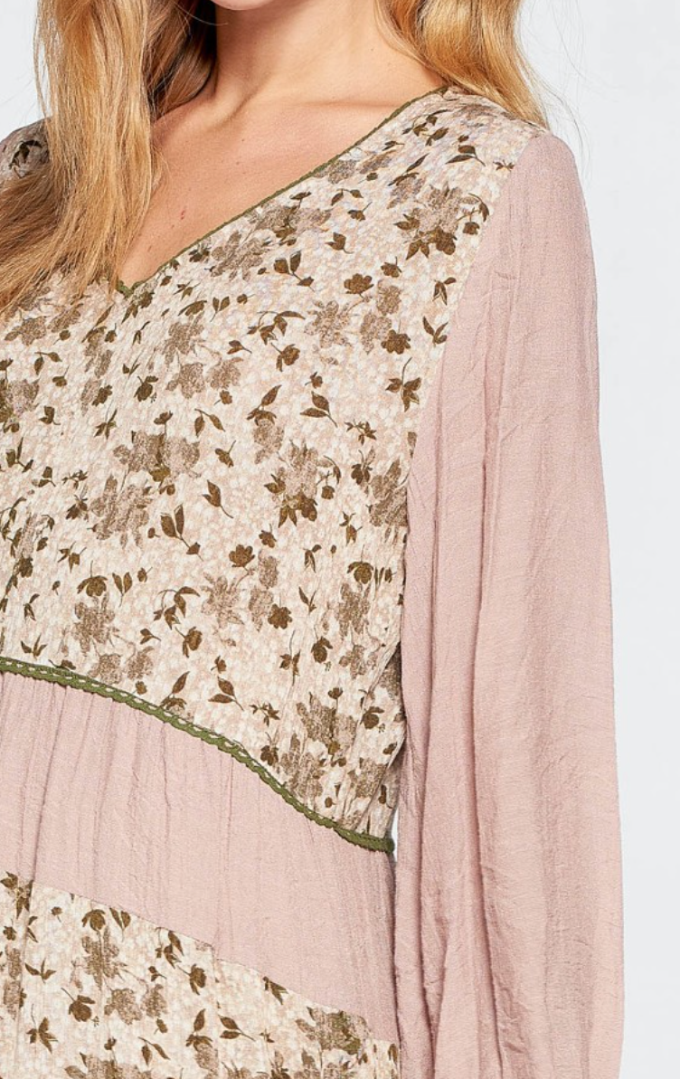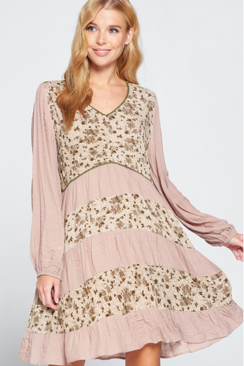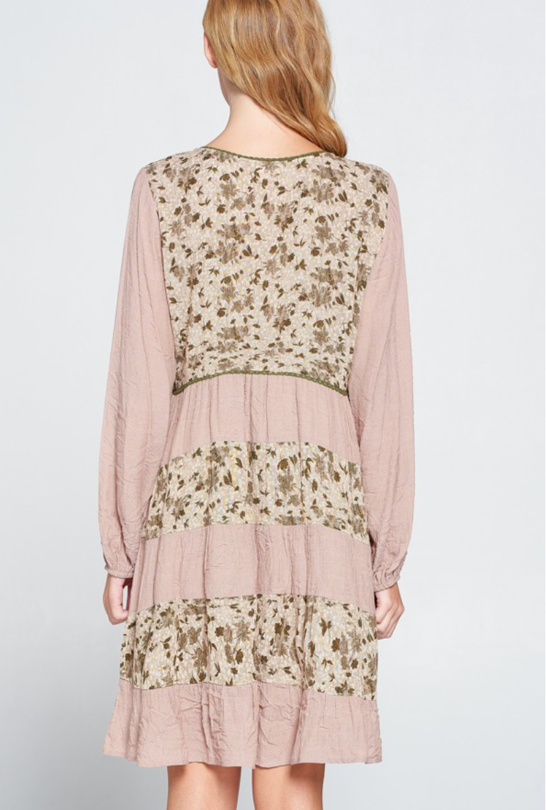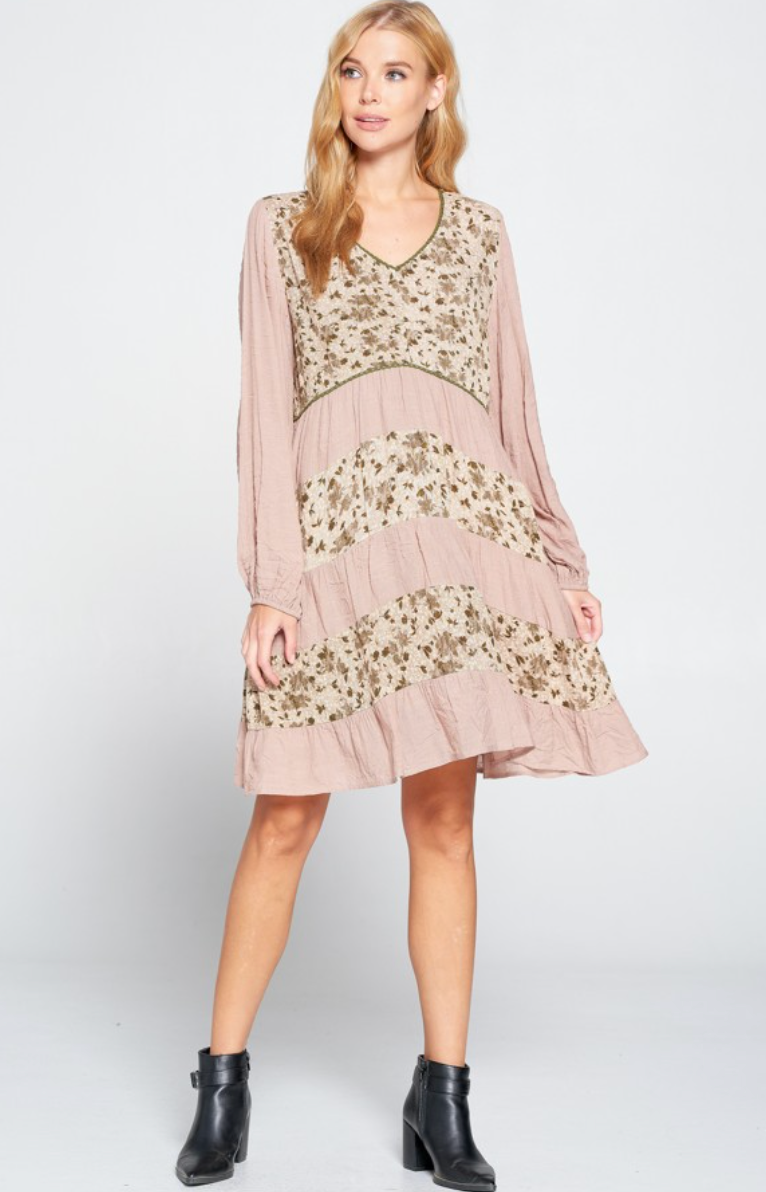 This taupe/pink print-blocked floral mini dress features a v-neckline, long puff sleeves and tiered detail. Full Length: 36"