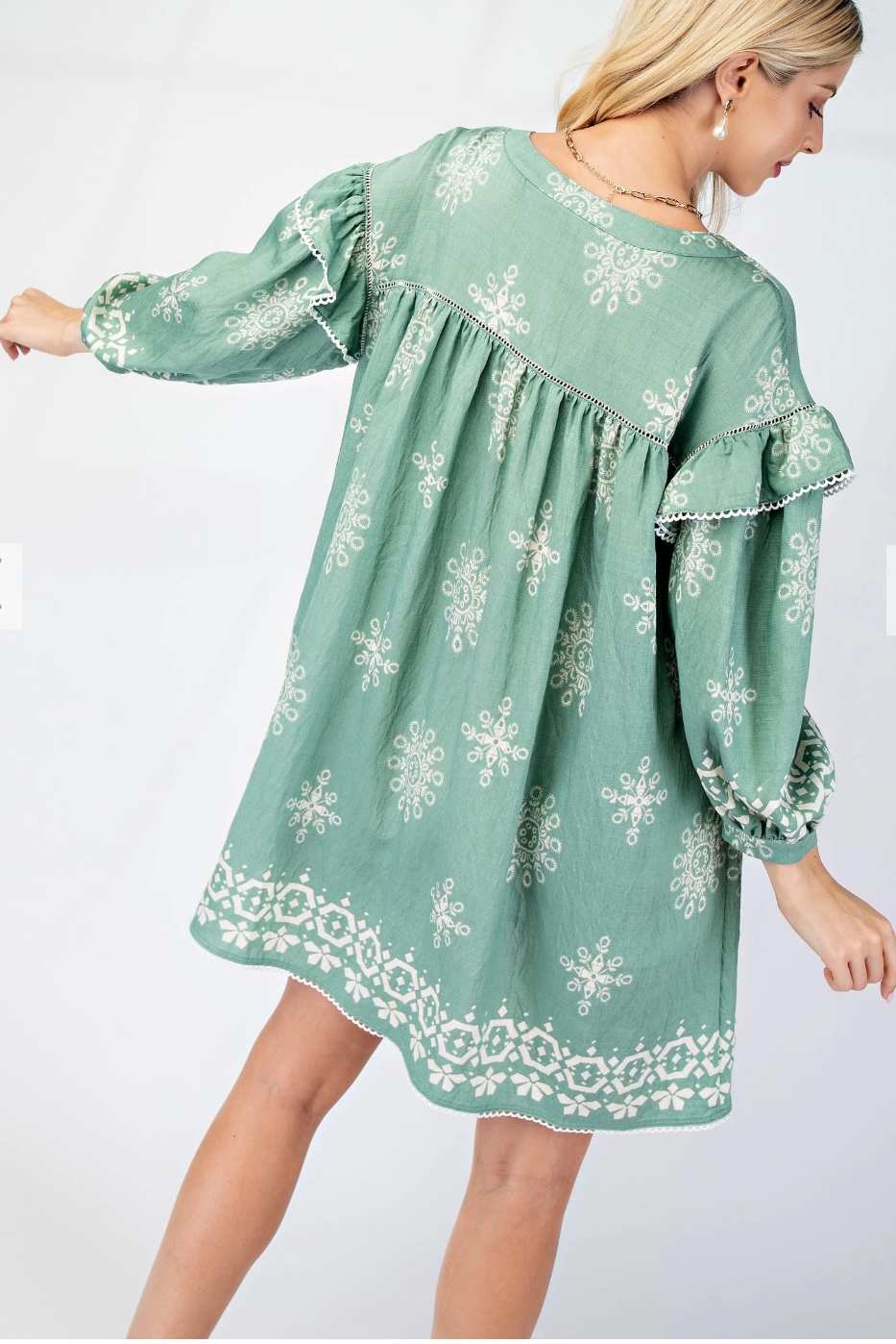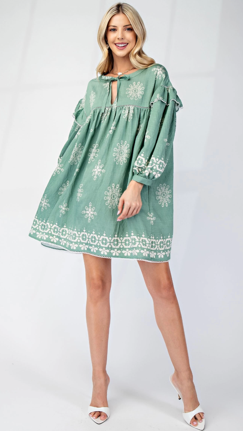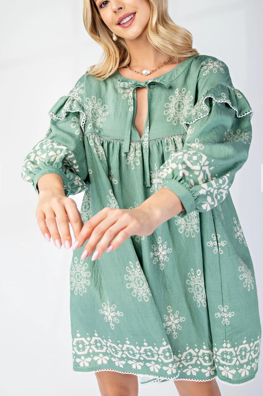Expertly crafted with elegance in mind, the Sage Beauty Queen Dress is a must-have addition to your wardrobe. This stunning long sleeve babydoll dress features a neck tie and decorative trimmed ruffle details for a touch of femininity. Perfect for any occasion, this dress exudes style and grace.