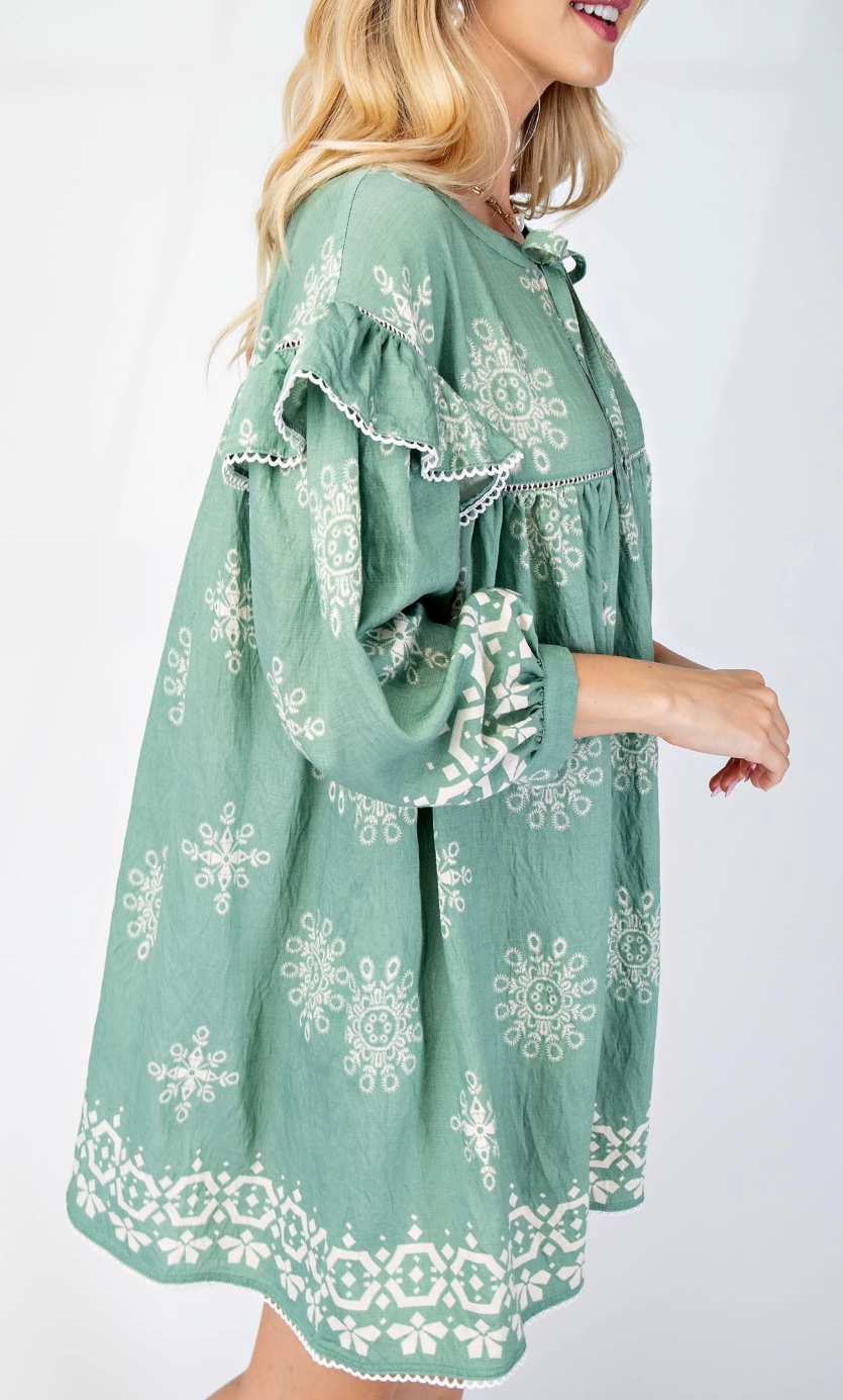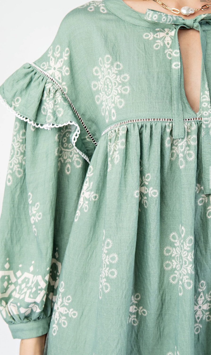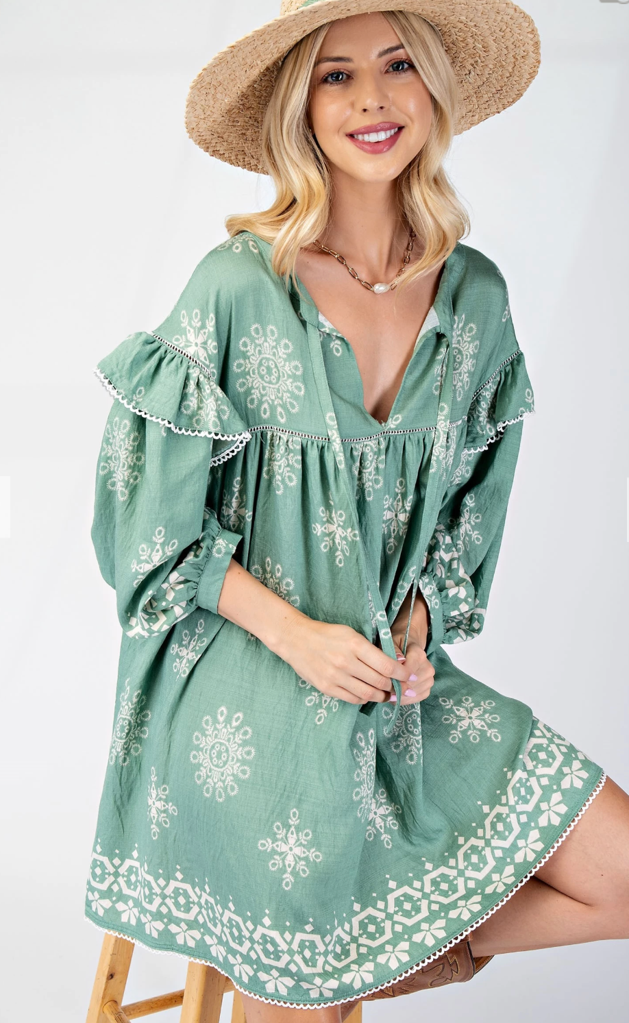 Expertly crafted with elegance in mind, the Sage Beauty Queen Dress is a must-have addition to your wardrobe. This stunning long sleeve babydoll dress features a neck tie and decorative trimmed ruffle details for a touch of femininity. Perfect for any occasion, this dress exudes style and grace.