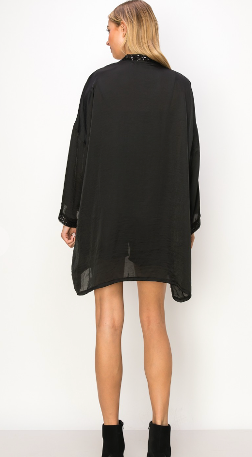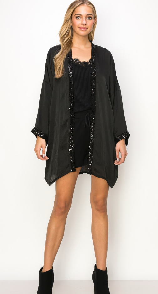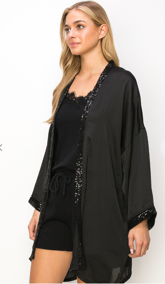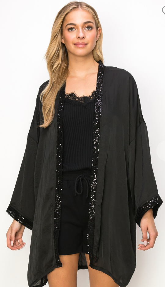 Introducing the Satin Sequin Trim Kimono, a one-size kimono featuring soft washed satin woven fabric with a feminine look. This elegant garment is embellished with a sequin trim for added style, while the 100% polyester fabric ensures comfortable wear. Hand wash recommended for best results.