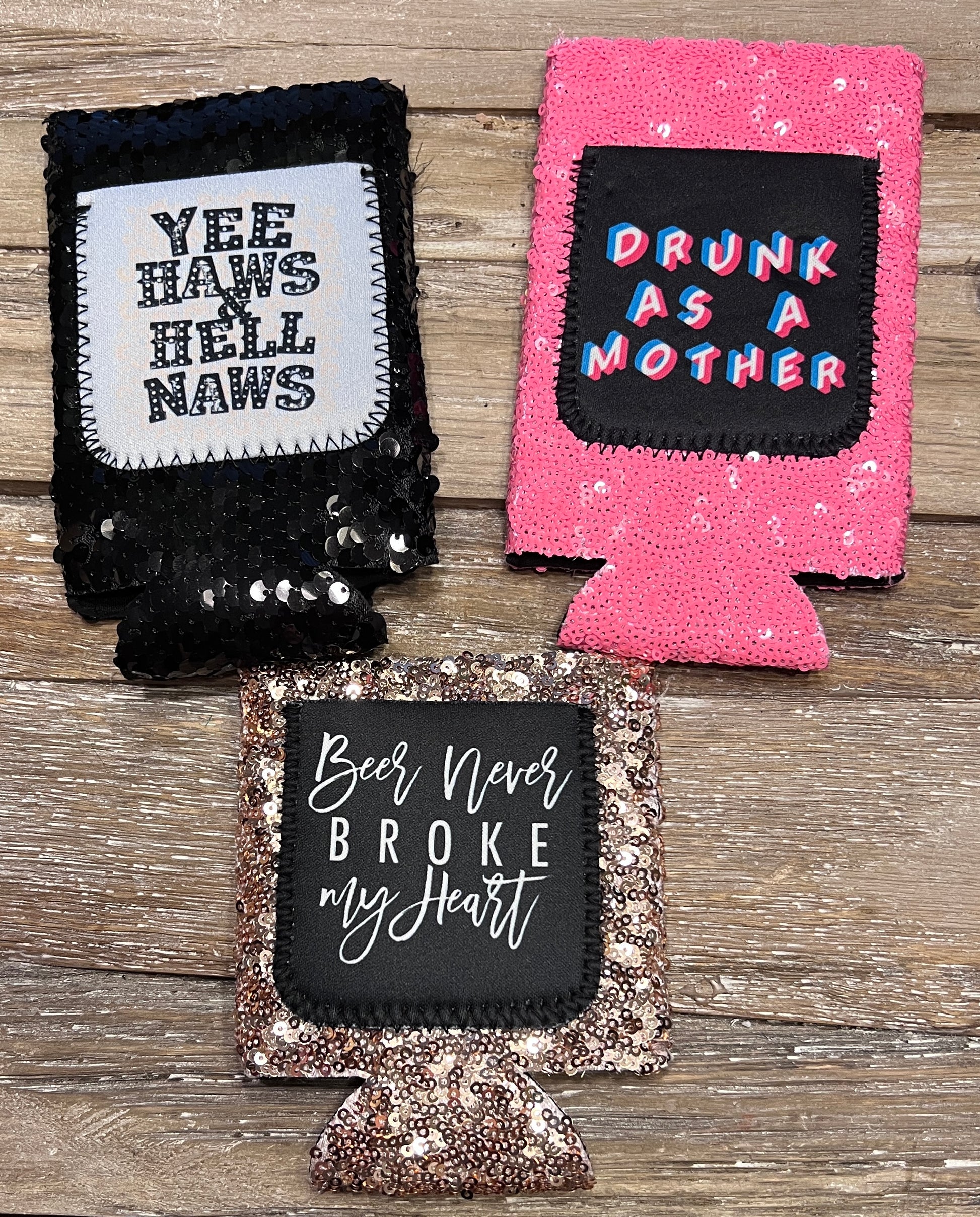 Our sequined can coolers/koozies are designed for the active and stylish user in mind. This can cooler will help keep your drinks cold for hours, and fits all slim shaped cans (**the gold sequin one will fit the regular size cans) perfectly. 100% genuine neoprene sleeve that keeps the temperature cold, and an additional added square for the design, so moisture does not affect the designed area.Perfect gift for party favors, birthday gifts, vacation, wedding favors, and more!