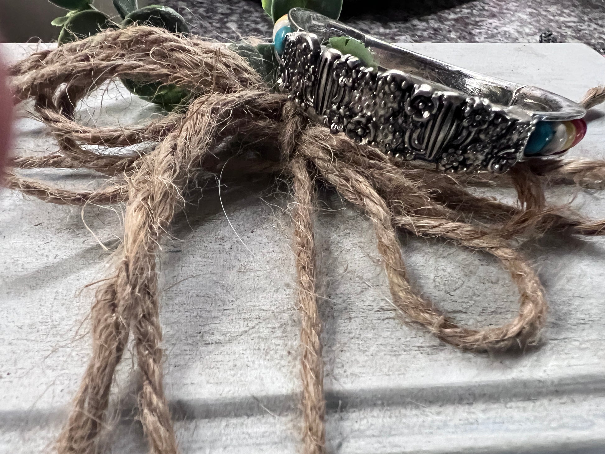 This stretch bracelet combines both modern and classic vibes, with a splash of western spirit. It features Silver, multi-rainbow colored beads, tiny Silver etched cactus, and is set in a Silver setting.