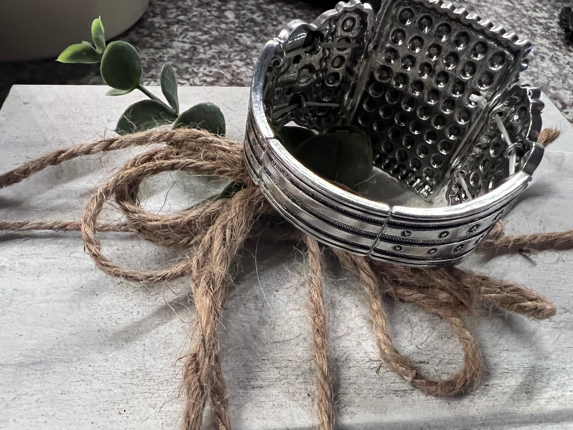 This bracelet is definitely a statement piece! Beautiful Silver and Turquoise studded stretch bracelet.