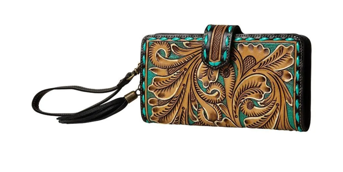 Classic, beautiful western hand-tooled wallet with turquoise accents. This wallet doubles as a wristlet. The interior features plenty of room for cards, IDs and other important items.